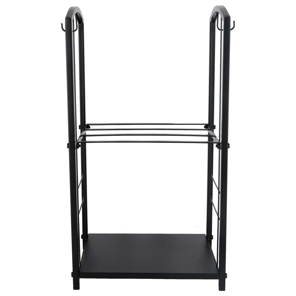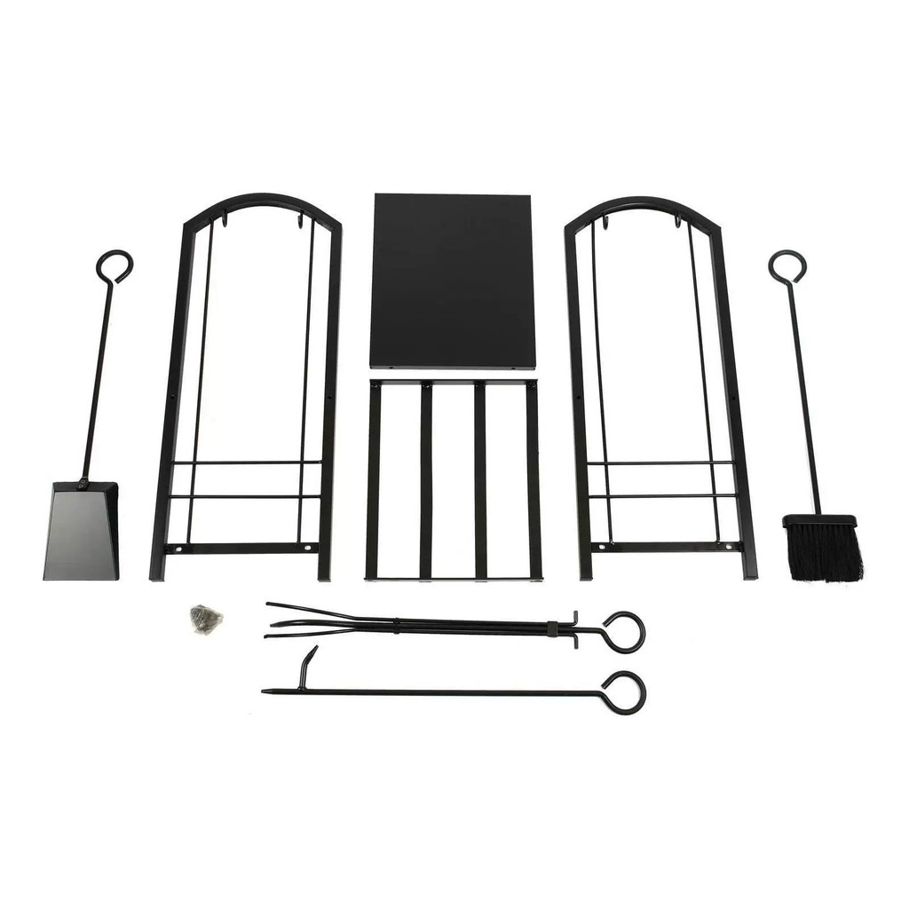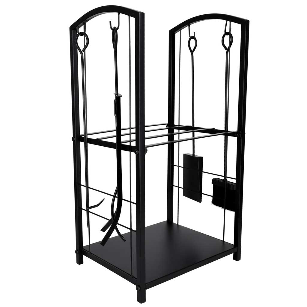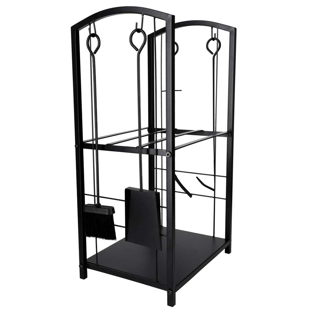 Fém kovácsoltvas állvány két polccal, szerszámtartókkal. Tartalmazza a következőket: seprőgép, fogó, piszkavas, szemétlapát és rögzítőkészlet. Teherbírás 20 kg. A stabil szerkezet megkönnyíti a fa rendszerezését és a kandalló üzemeltetését.