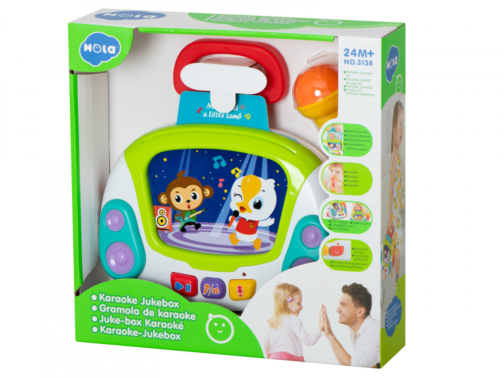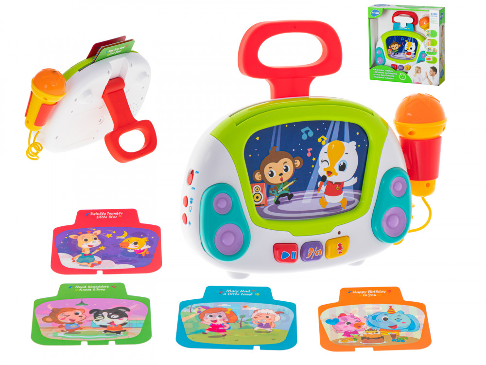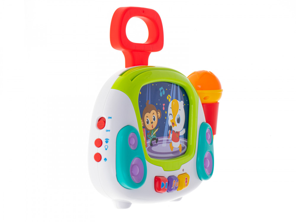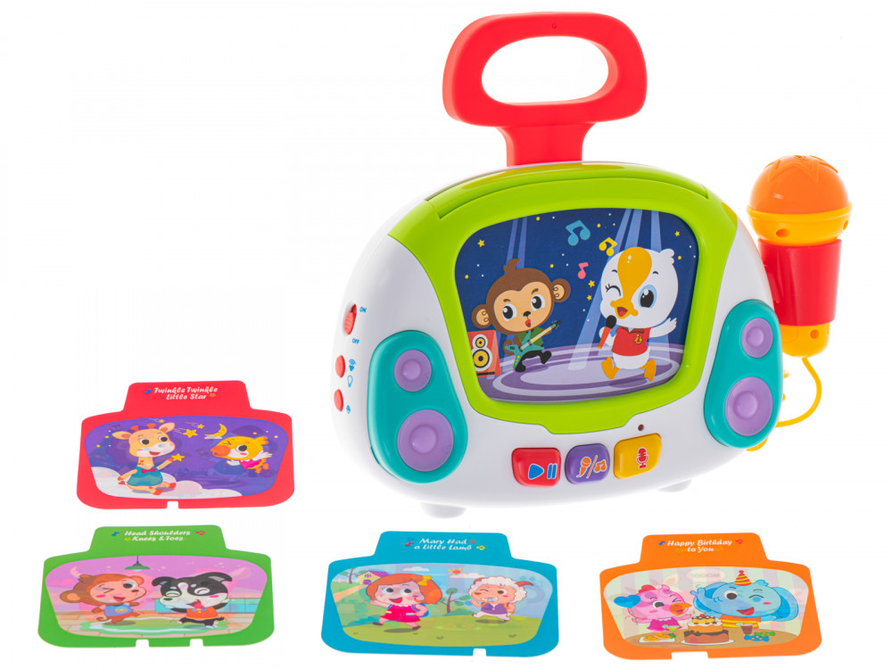 Interaktív karaoke szett. Kis művészek számára készült. A készlettel való játék fejleszti a ritmusérzéket és a kreativitást. Tápegység: 4x 1,5V AA (nem tartozék). Anyaga: műanyag. A készlet méretei: 25x23x6cm.