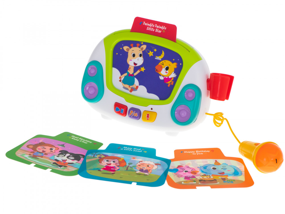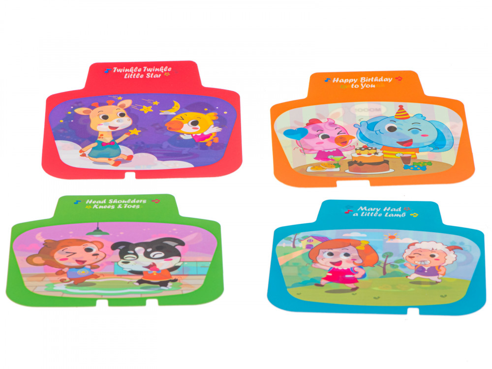 A Karaoke 9 színes, különböző eseményeket ábrázoló képet tartalmaz. Amikor behelyezi őket a panelbe, angol nyelvű dalok indulnak el.