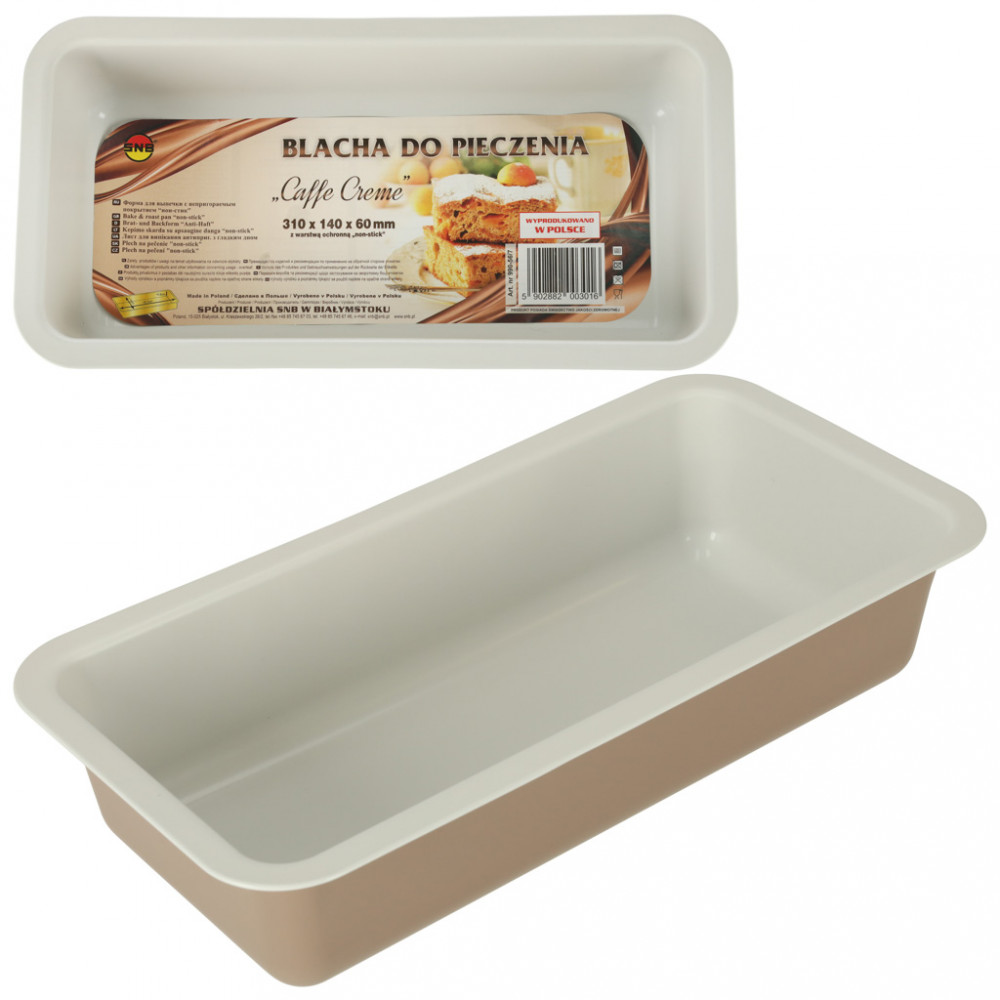 Hosszúkás préselt tepsi - tökéletes kenyér vagy keksz sütéséhez. Sima alja és lekerekített szélei vannak. Gáz- és elektromos sütőben használható. Szín: barna és krémszínű. Anyaga: acél tapadásmentes bevonattal. Méretek: 31 cm x 14 cm x 7 cm.