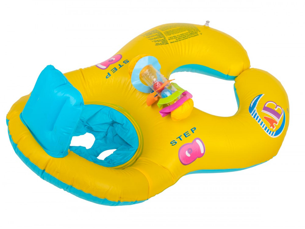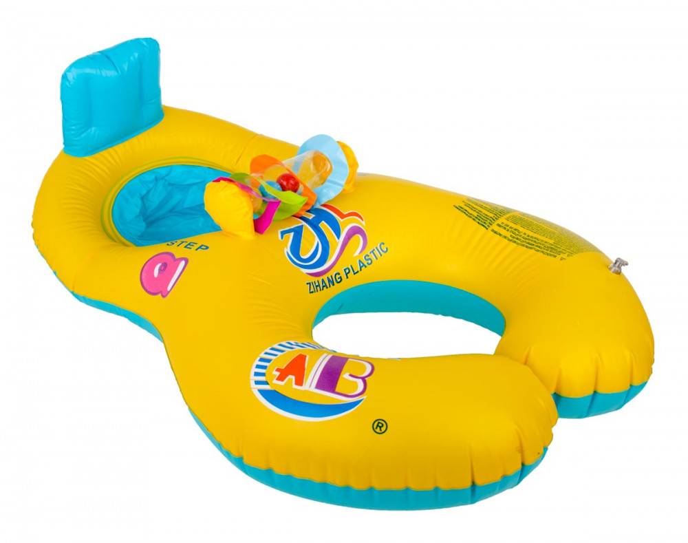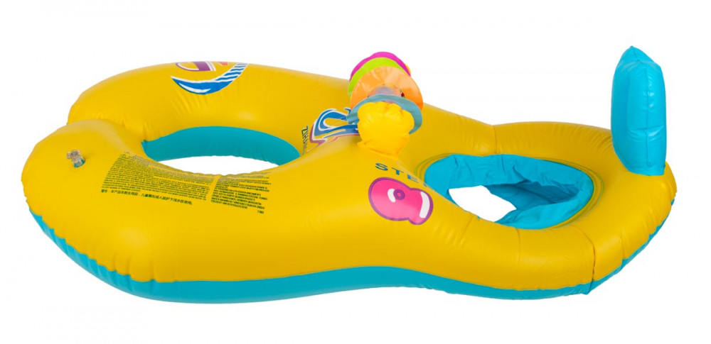 Felfújható csónak, amely biztonságos háttámlával és két rekesszel van felszerelve a gyermek lábai számára. A színes játék felkelti a kisgyermek figyelmét. A pontonon van egy további ülés a szülő számára. PVC műanyagból készült. Sárga színben kapható. Méretek: 83x60cm.