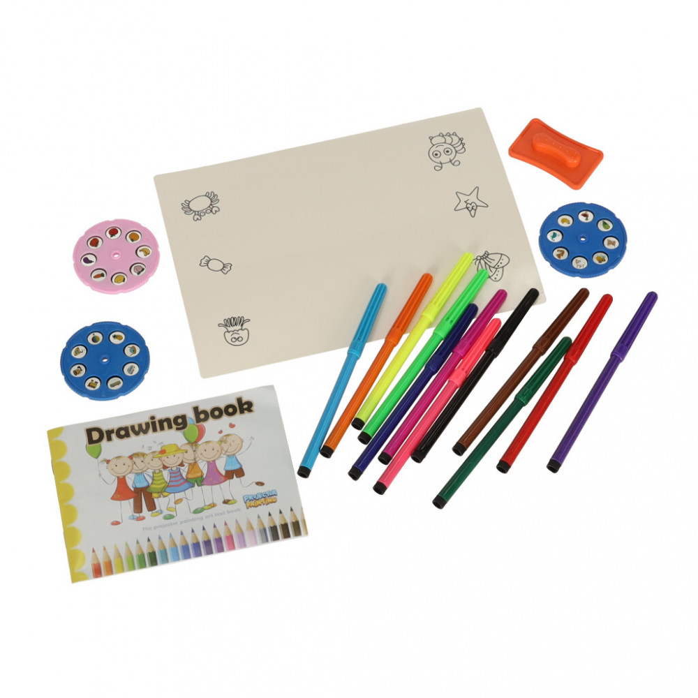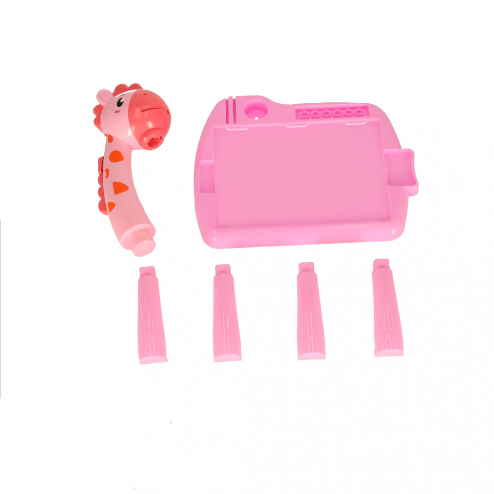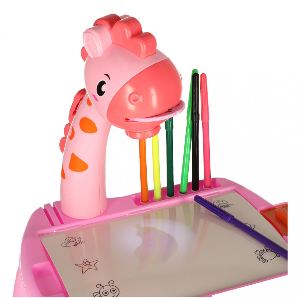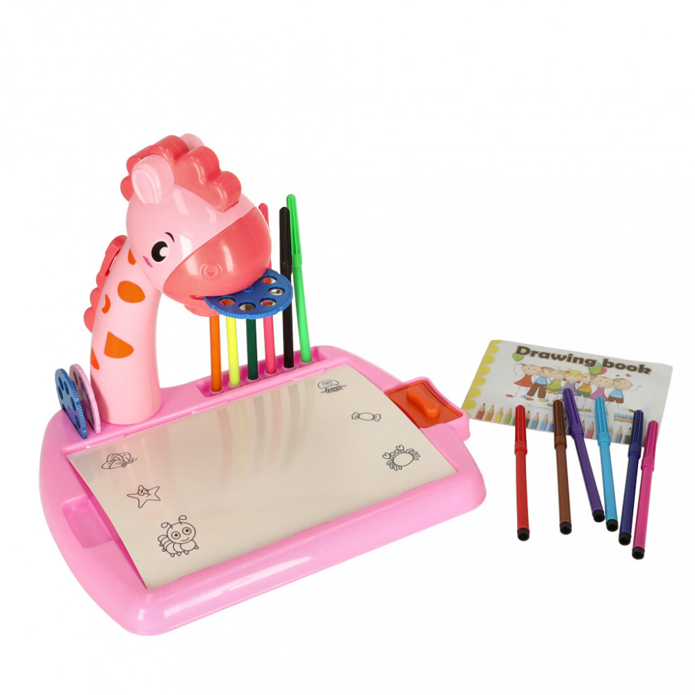 Gyermek rajzoló kivetítő egy rózsaszín barátságos zsiráf formájában. A kivetítő segítségével történő rajzolás fejleszti a kézügyességet és javítja a rajzkészséget. Minden szükséges tartozékot tartalmaz a kis művész számára. Méretek: 31 cm x 35 cm x 24 cm.
