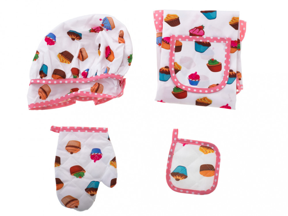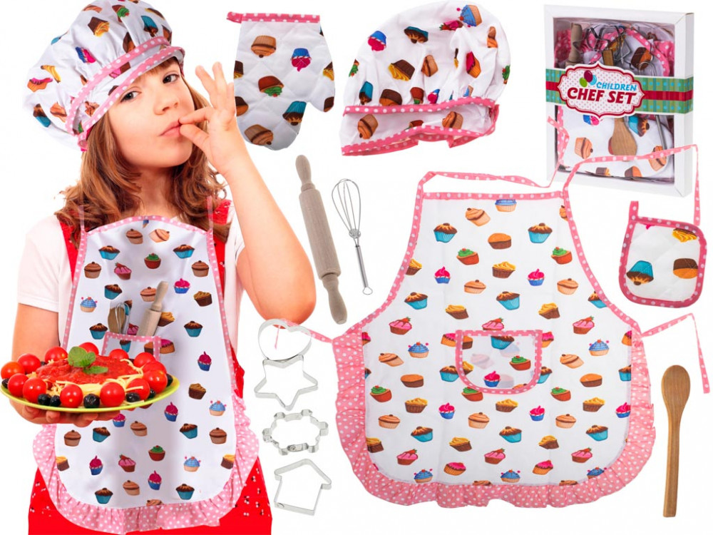 Gyönyörű készlet egy kis konyhai segítőnek. Minden gyermeknek tetszeni fog. A kötény megvédi a gyermek ruháját a közös főzés közben. Anyag: poliészter/fa/fém. A kötény méretei: 45.5x54cm. Henger hossza: 20cm.