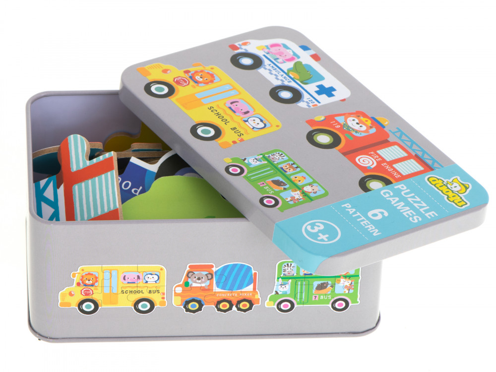 Egy mesésen színes oktató puzzle. A játék megtanítja a kisgyermeket a logikus gondolkodásra és a türelemre. A kirakós 30 puzzle-ból áll, amelyekből a kisgyermek 6 különböző járművet rakhat össze. Az iskolabusz méretei (hossz x szélesség): 17.5cm x 10.5cm.