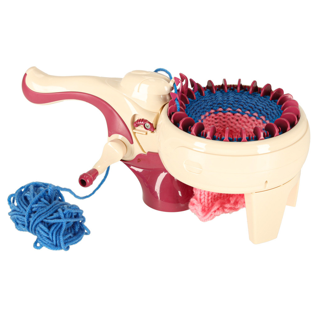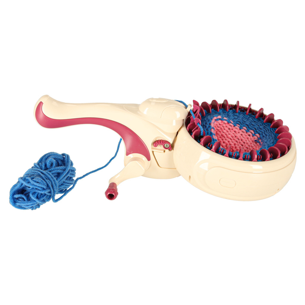 Kötőgép 6+ gyermekeknek. Kézi hajtókaros meghajtás, két üzemmód: kerek és lapos. Tartalmazza: tű, horgolótű, 5 köteg fonal (70% akril, 30% gyapjú). A gép méretei: 30×12 cm, munkaszélesség: 13,5 cm.