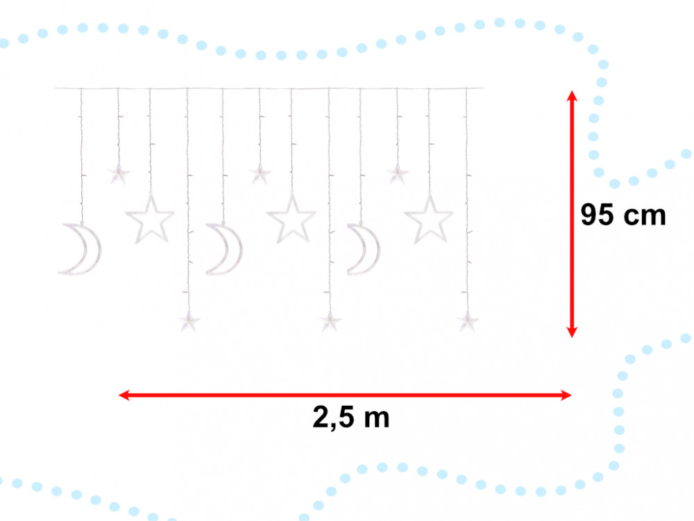 Fantasztikus LED függöny holdakkal és csillagokkal, hogy ünnepi hangulatot kölcsönözzön bármely belső térnek. A lámpák színe: meleg fehér. Tápellátás: hálózat. Függöny hossza: 2,5 cm. Tápkábel hossza: 3m. Csomagolási méretek: 20x20x13cm.