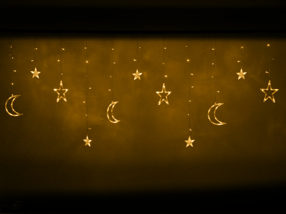 Ez a gyönyörű fényfüggöny holdakkal és csillagokkal ragyogást kölcsönöz bármely belső térnek.