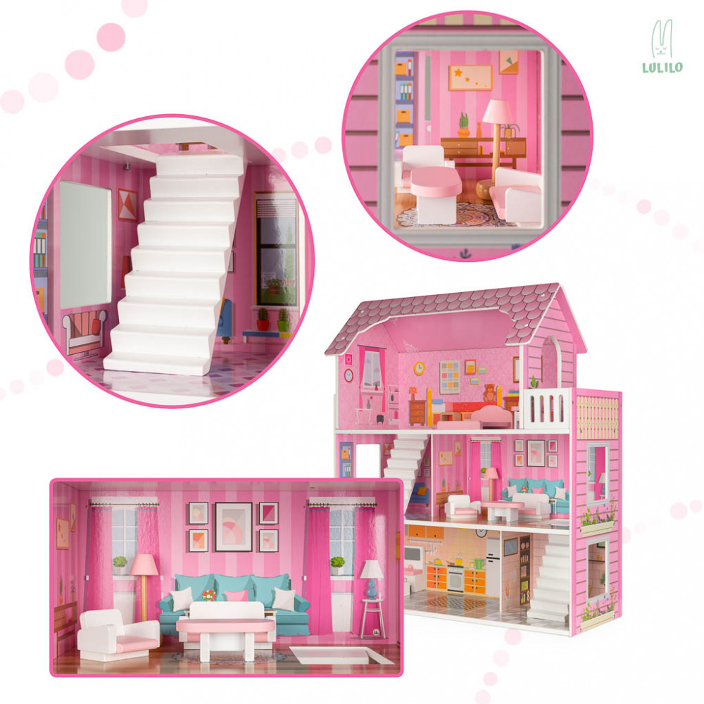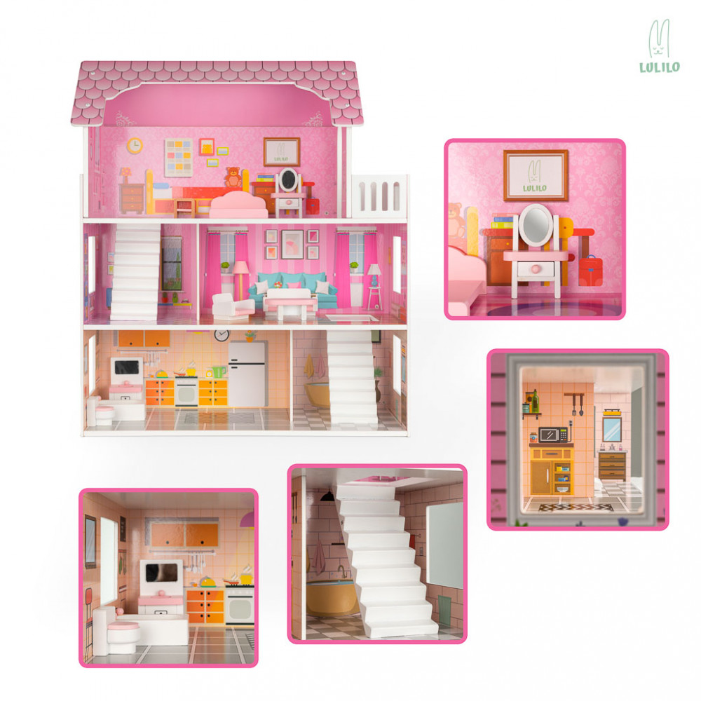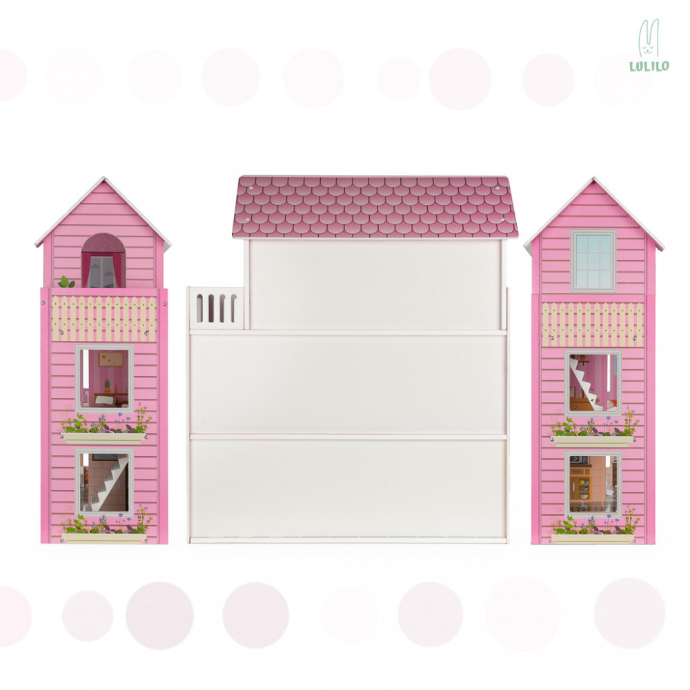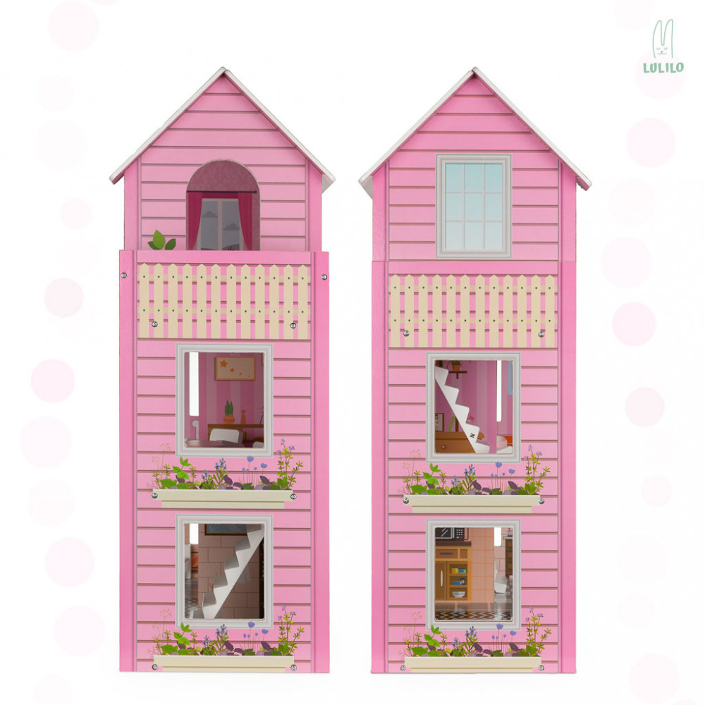 A fantasztikus LULILO faház rózsaszínben, amely akár 3 emelettel, 5 független szobával és sok bútorral rendelkezik. A házzal való játék serkenti a képzeletet és fejleszti a kreativitást. A ház méretei: 70x59x22.5cm. Emeletek közötti magasság: 18,5 cm.