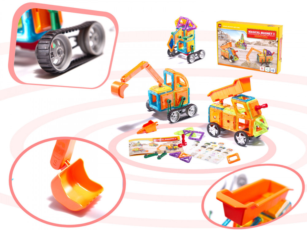 Kisméretű mágneses téglákból álló készlet, amely játszó óriáskerék és kerekes járművek építéséhez szükséges elemeket tartalmaz, amelyekkel mindenféle mintázat, forma és alakzat létrehozható, és csak a fiatal tervező fantáziája szab határt.