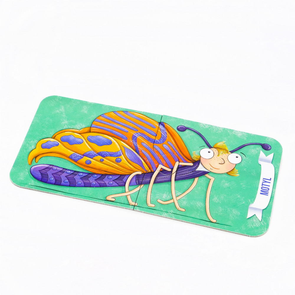 MUDUKO kétrészes ökopuzzle a legkisebbeknek "Barátkozzunk a rovarokkal". Szórakoztató egy rovar fejét és testét összekapcsolni - ez fejleszti a motoros készségeket, de emellett megismerheted a körülötted élő rovarokat is. A kirakók száma: 15 pár. Életkor: 18m+