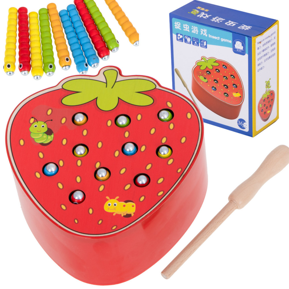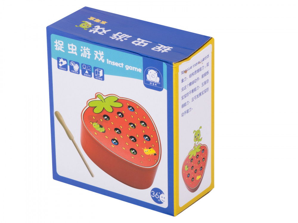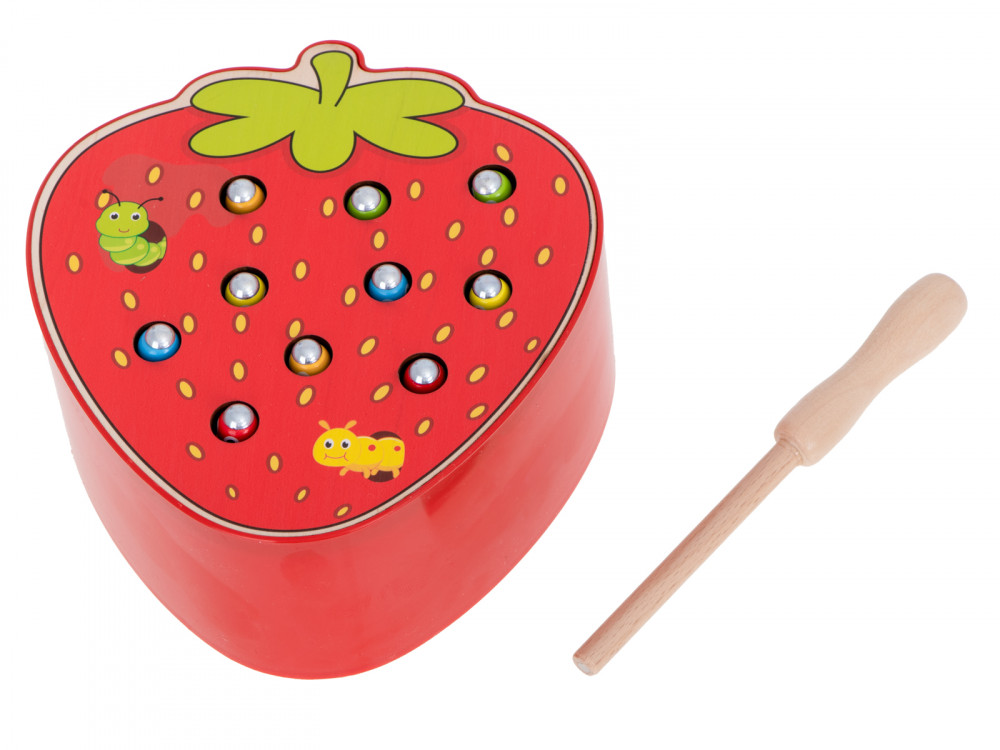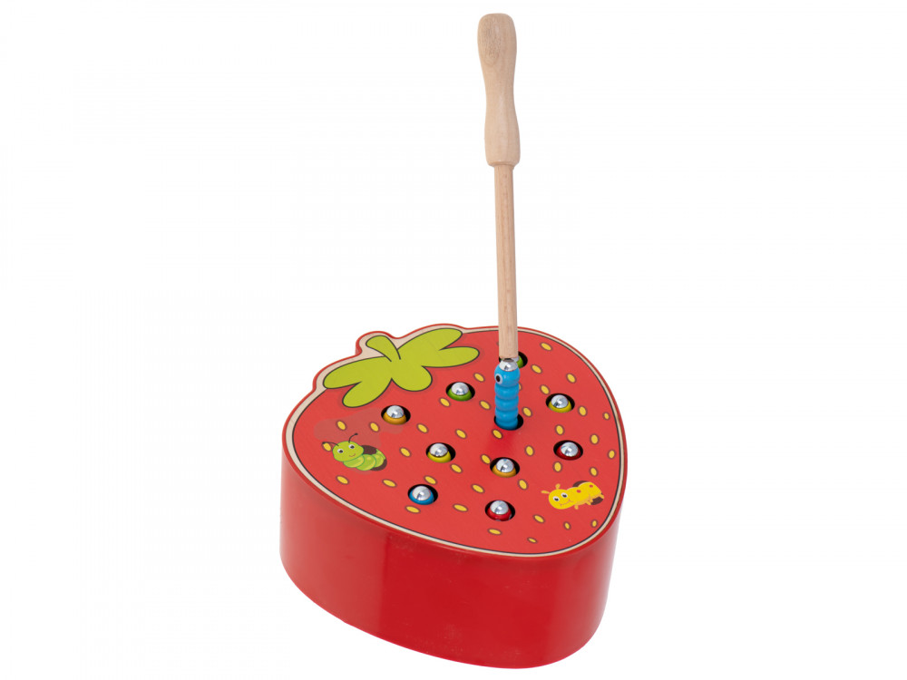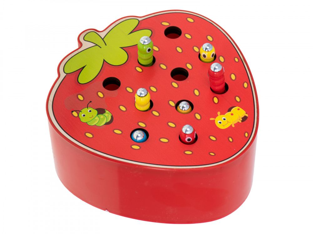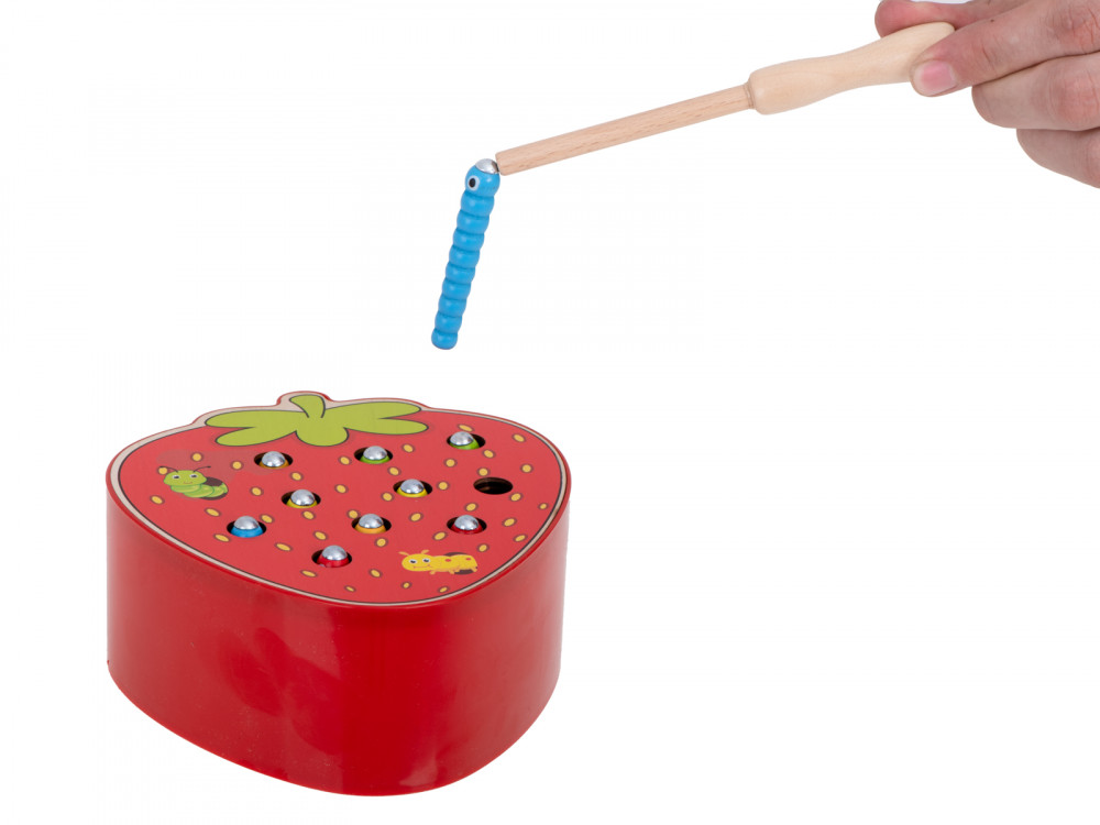 Eper alakú, fából készült mágneses játék. A játék során 10 színes kukacot kell eltávolítani egy mágnessel végződő pálcika segítségével. Serkenti a logikus gondolkodást és az ügyességet. Anyag: fa, műanyag, fém. Méretek: 14.5x15x6.5cm.