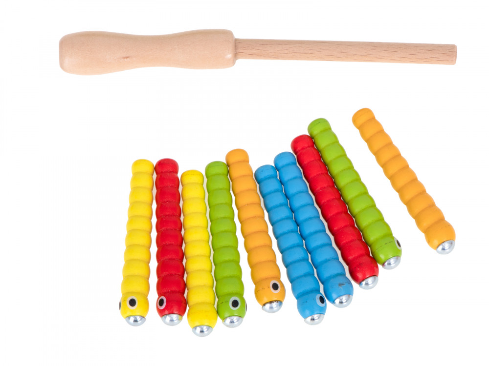 A készlet tartalmaz egy eper alakú alapot, amely 10 színes, fából és fémből készült hernyót rejt, valamint egy fapálcát, amelynek a végén mágnes található.