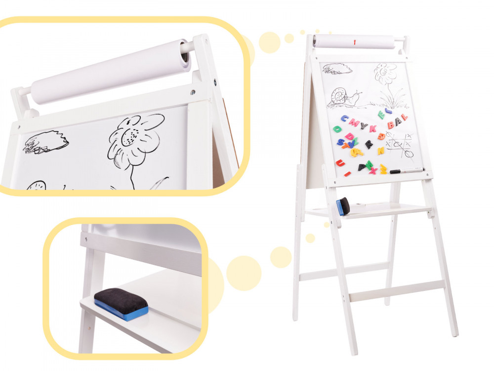 Egy fantasztikus kétoldalas mágneses krétatábla. Minden gyermek álma valóra válik. Tökéletes lesz az írás, a számolás és a betűk tanulására. A készlet a következőket tartalmazza: tábla, betűmágnesek, szivacs, kréta, filctoll. A tábla méretei: 43x32x115cm.