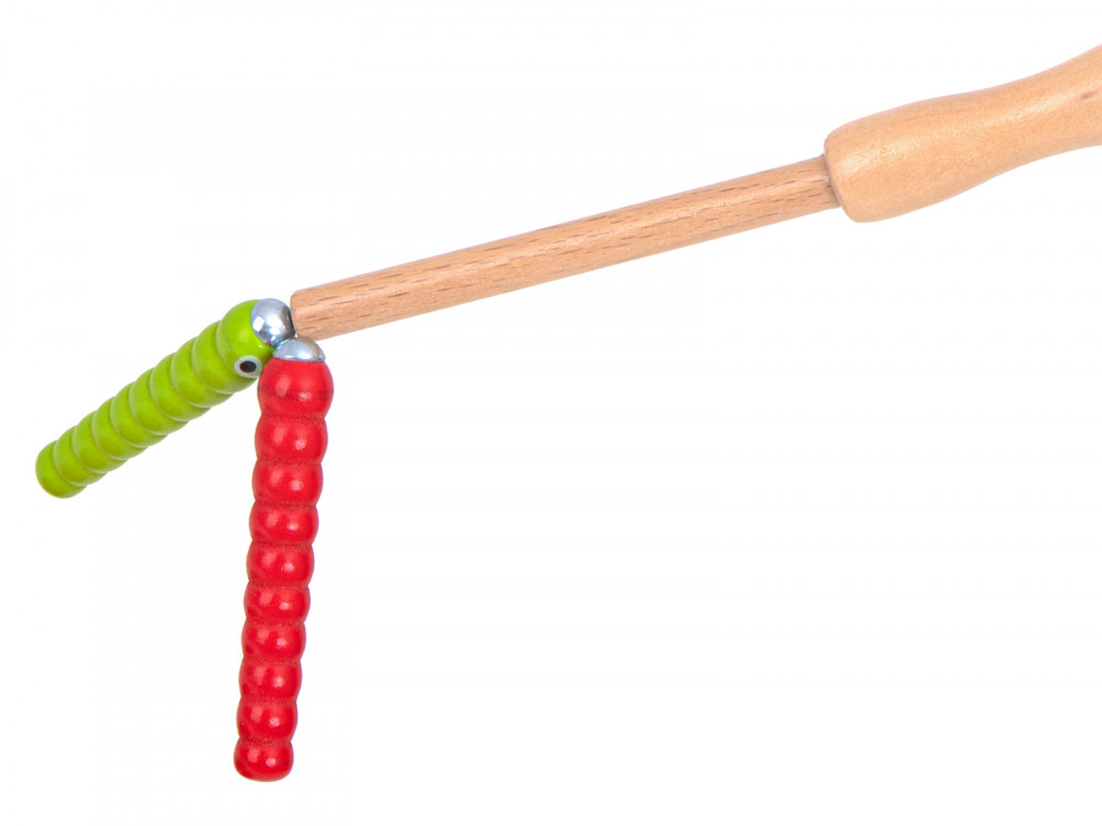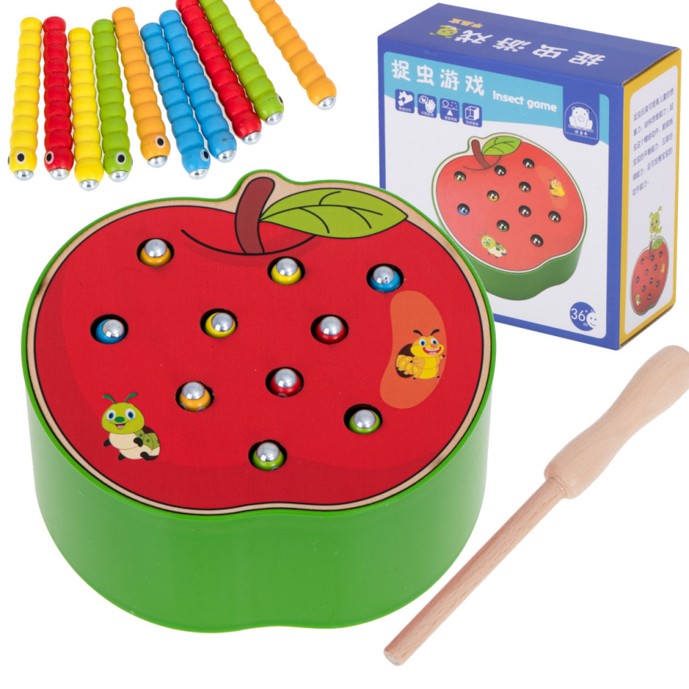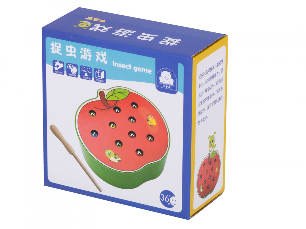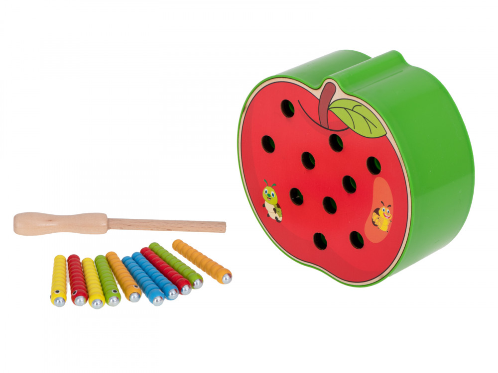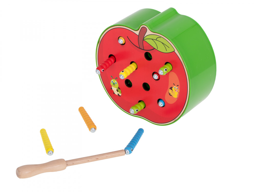 Alma alakú, fából készült mágneses játék. A játék során 10 színes kukacot kell eltávolítani egy mágnessel végződő pálcika segítségével. Serkenti a logikus gondolkodást és az ügyességet. Anyag: fa, műanyag, fém. Méretek: 15.5x15x6.5cm.