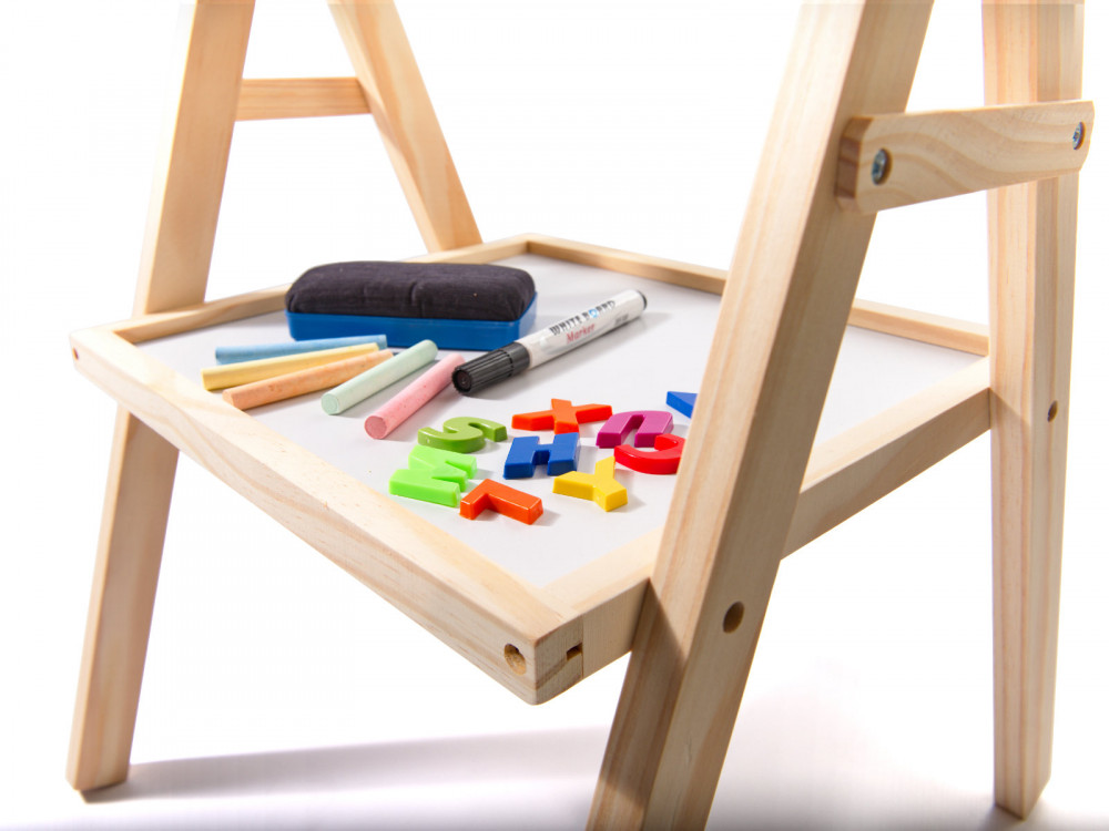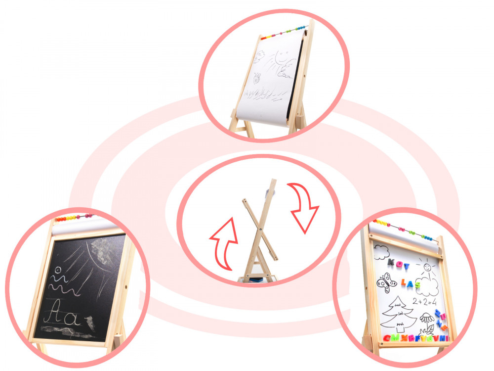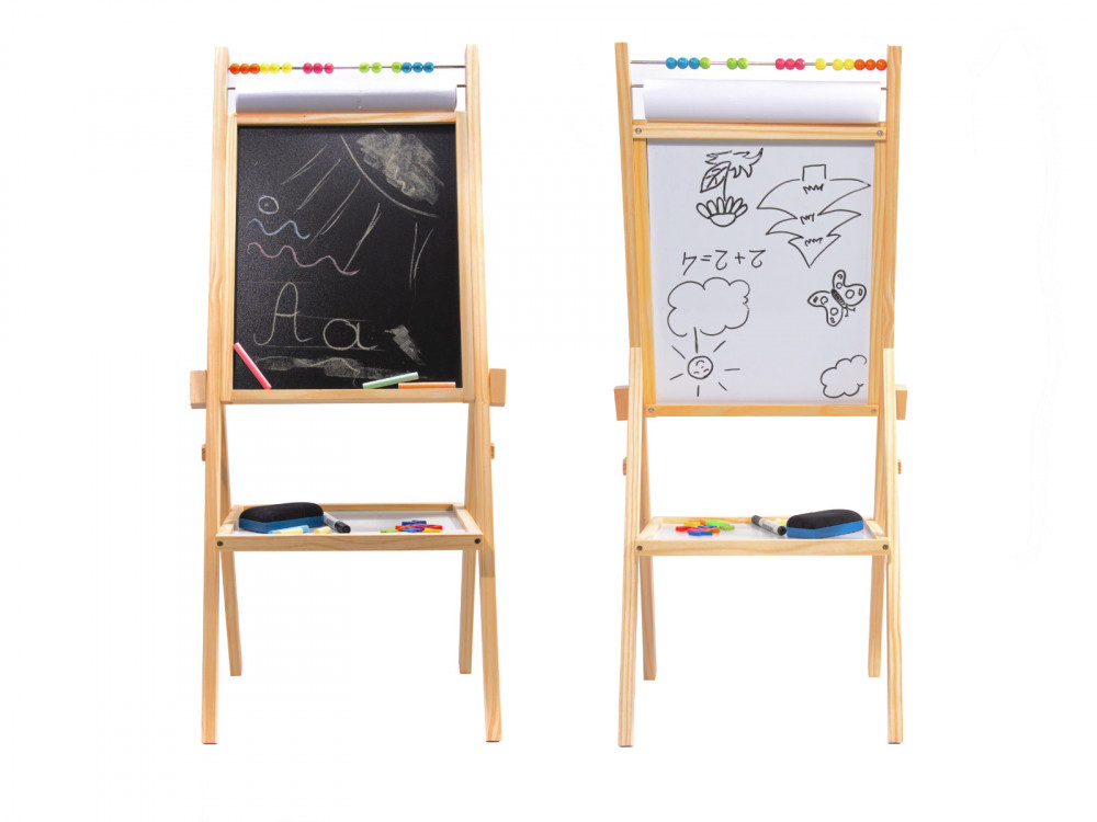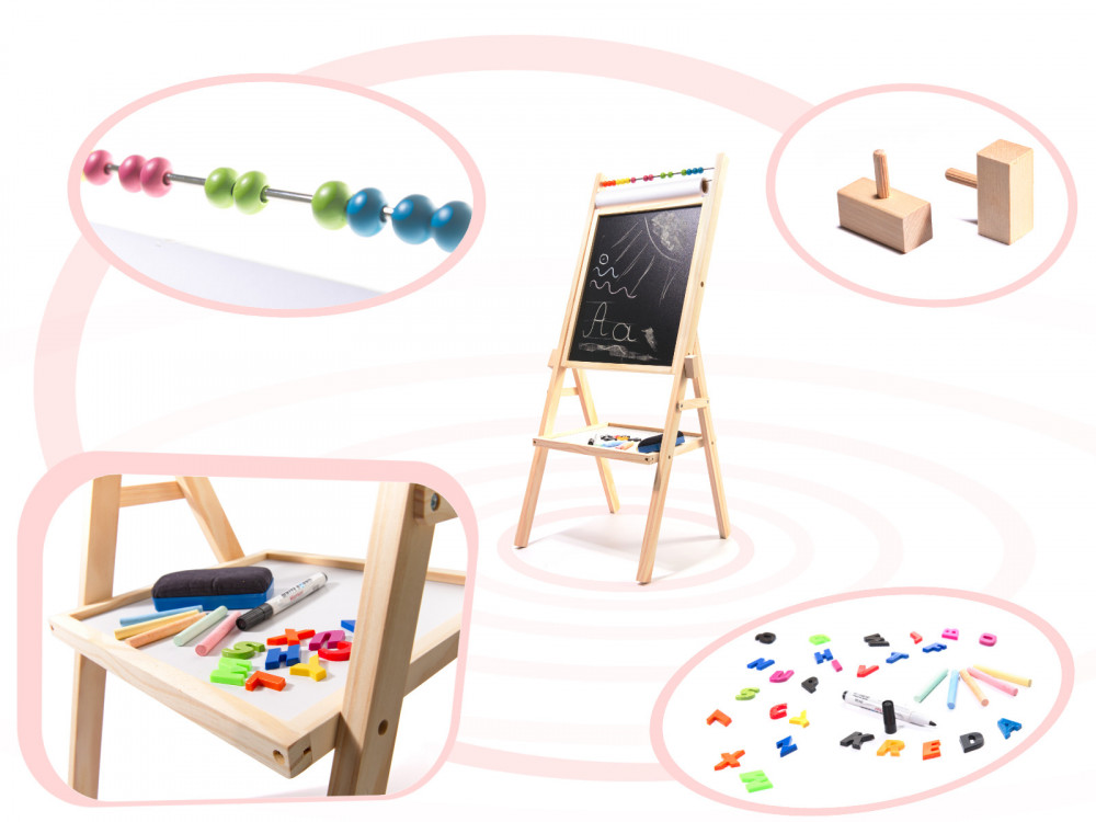 Forgatható, kétoldalas mágneses krétatábla fakeretben. Ezen kívül van egy abakusz és egy tekercsre csomagolt papír. Tanulás és szórakozás egyben. A készlet tartalmazza: 25 betűmágnes, fekete filctoll, 5 színű kréta és szivacs. Méretek: 90x37x39cm.