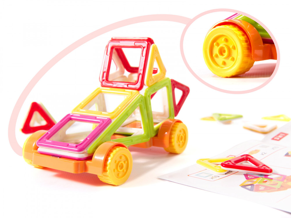 Nagyméretű mágneses blokkok készlete kerekekkel. Lehetővé teszi gyermeke számára, hogy egyszerű kerekes járműveket építsen.