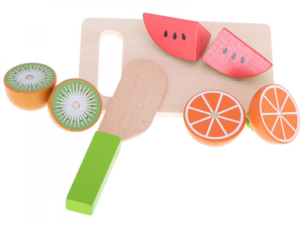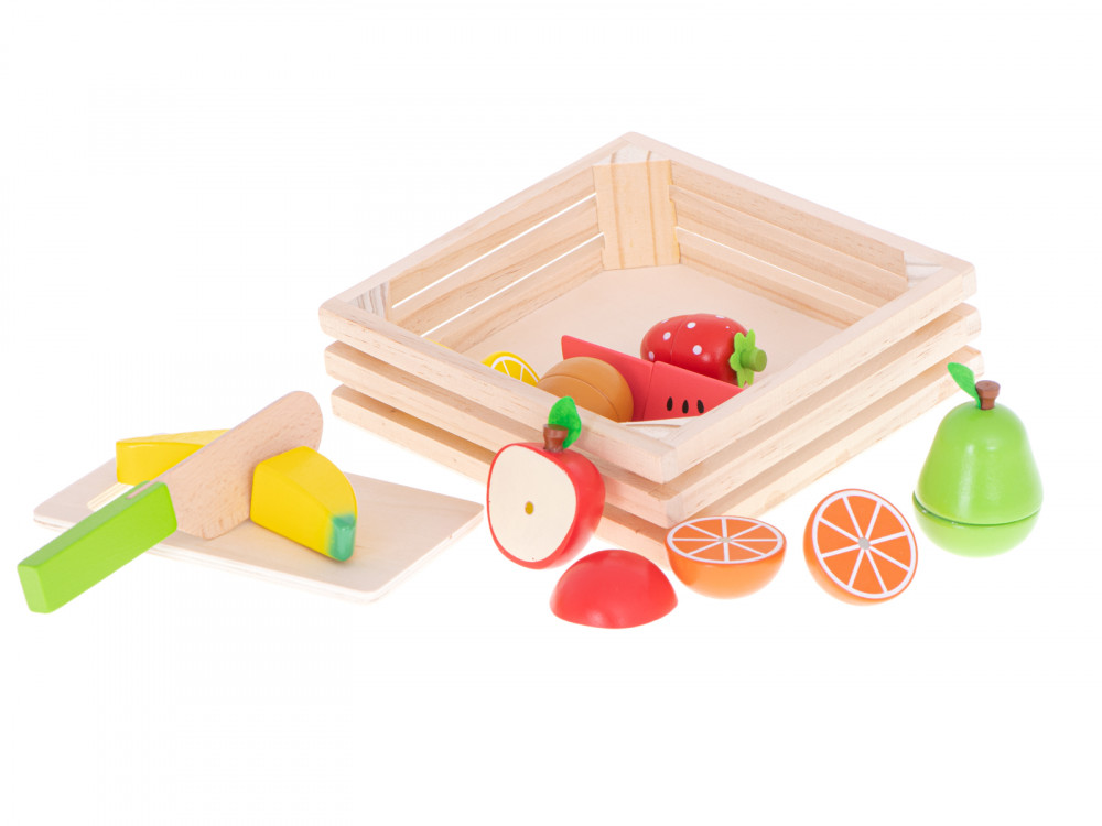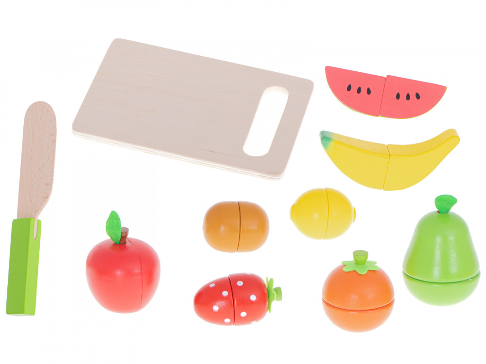 Mágneses fa gyümölcsök tartozékokkal. Nagyszerű szórakozás a legkisebbeknek. A késsel való vágás nagyszerű gyakorlat a szem-kéz koordinációra. A készlet tartalmazza: különböző gyümölcsök, deszka, kés. A doboz méretei: 17.5x19.5x5cm. A tábla méretei: 15x10x0,5cm.