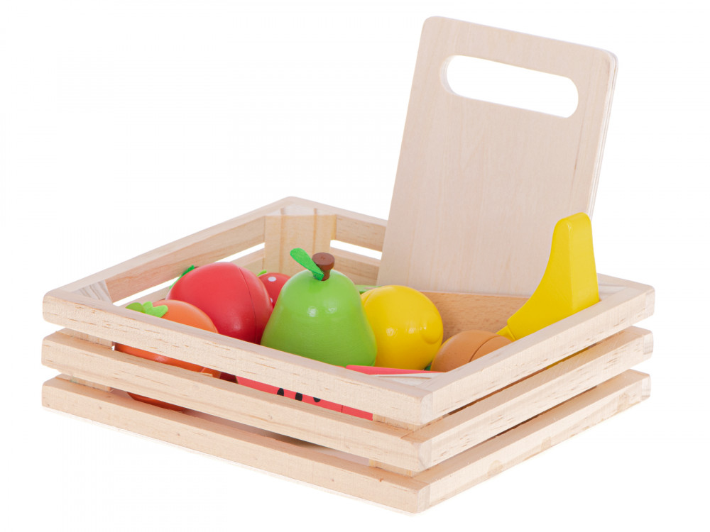 Színes gyümölcsök egy fadobozban, hogy finom gyümölcssalátát készíthess az összes babádnak és plüssállatodnak.