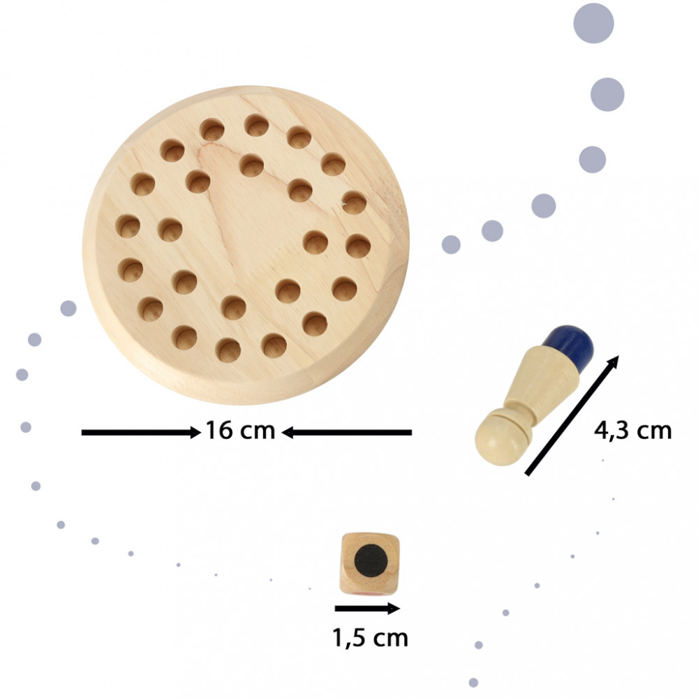 Egy fából készült kínai kirakós játék. Egy színt kell dobni a kockával, megkeresni a táblán, és minél több bábut összegyűjteni. A játék segíti a memóriát és a logikus gondolkodást. Tartalmaz: kerek alap, 24 bábu és egy kocka. A talp átmérője: 16 cm.
