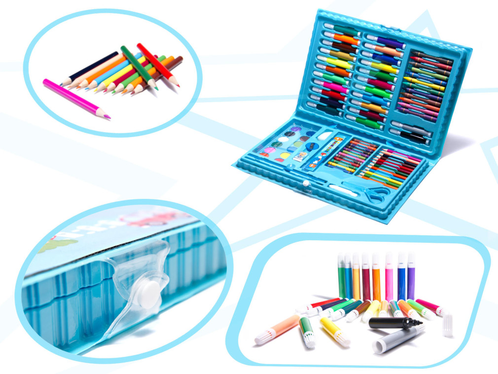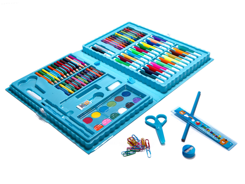 Fantasztikus művészeti készlet egy praktikus hordtáskában. Sok használati tárgyat tart: filctollakat, zsírkrétákat, festékeket és egyéb kiegészítőket. Ideális iskolai vagy otthoni munkához. A készlet 86 darabból áll. Szín: kék. A tok méretei: 34x22.5x3.5cm.