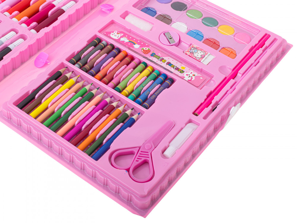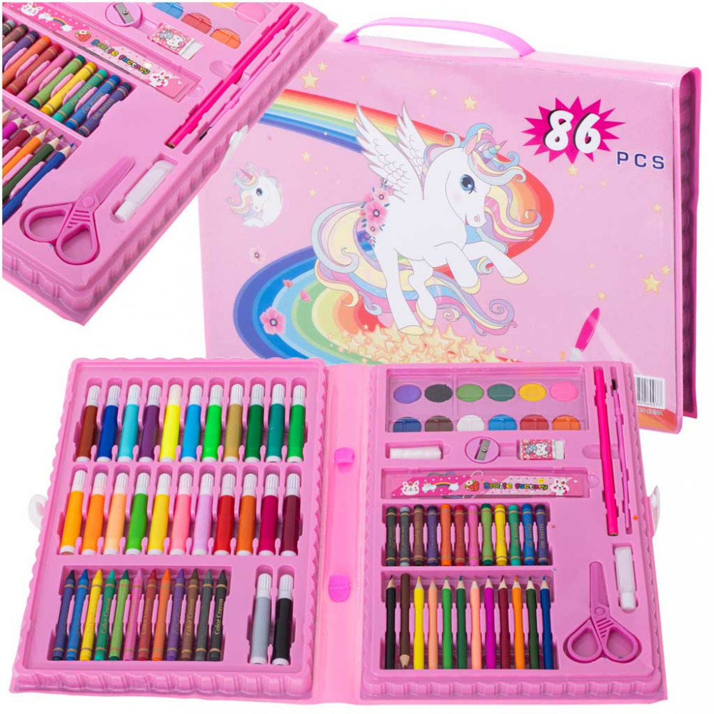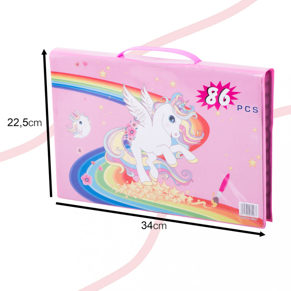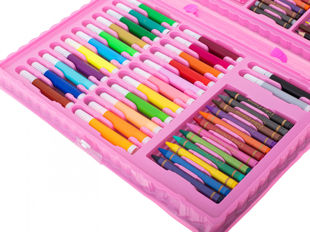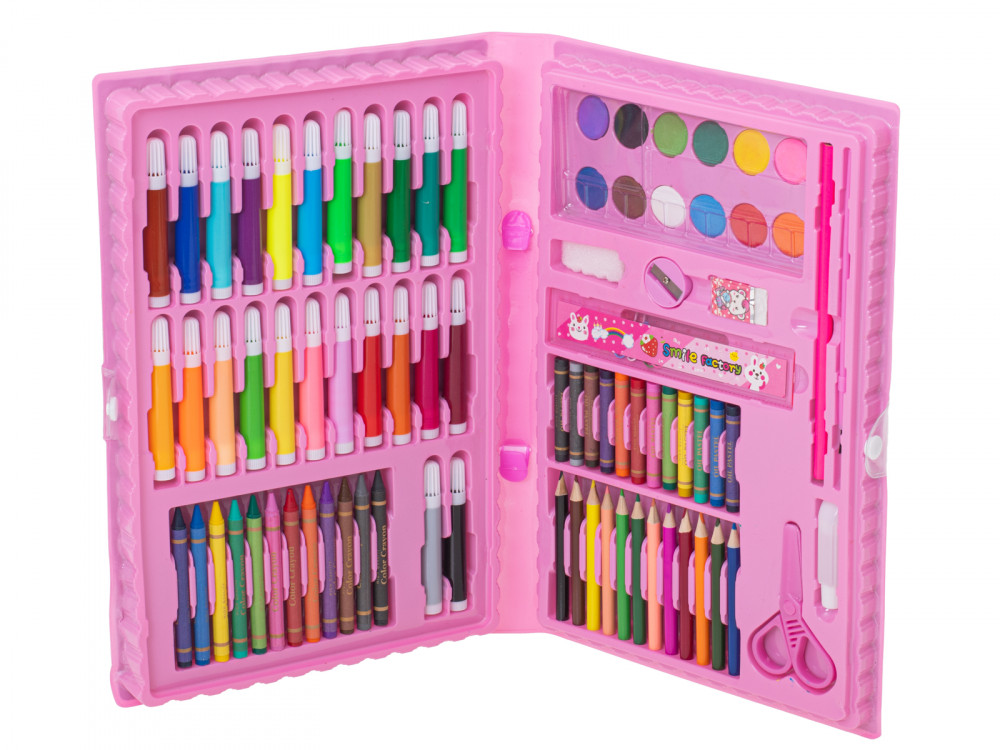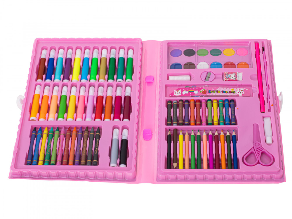 Fantasztikus művészeti készlet egy praktikus hordtáskában. Sok használati tárgyat tart: filctollakat, zsírkrétákat, festékeket és egyéb kiegészítőket. Ideális iskolai vagy otthoni munkához. A készlet 86 darabból áll. Szín: rózsaszín. A tok méretei: 34x22.5x3.5cm.