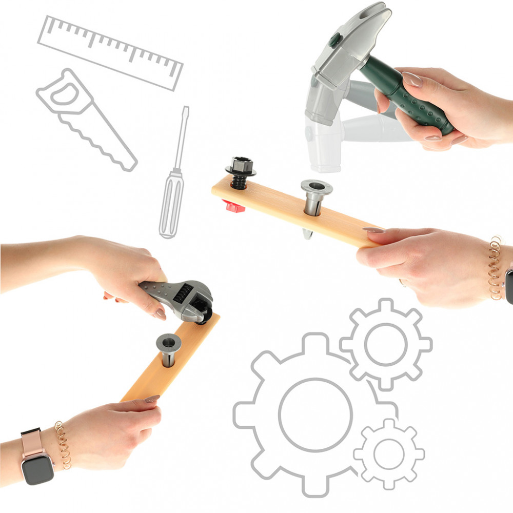De ez még nem minden lehetőség, amit az Ezermester készlet kínál - a számos mozdulat, amit a csavarok becsavarásakor, a deszkák elfűrészelésekor vagy a szögek beverésekor kell végrehajtani, kiválóan edzi a kézügyességet. Az ujjak pontossága, a finommotorika és a szem-kéz koordináció tökéletesen fejlődik a mesterember szerepében.
