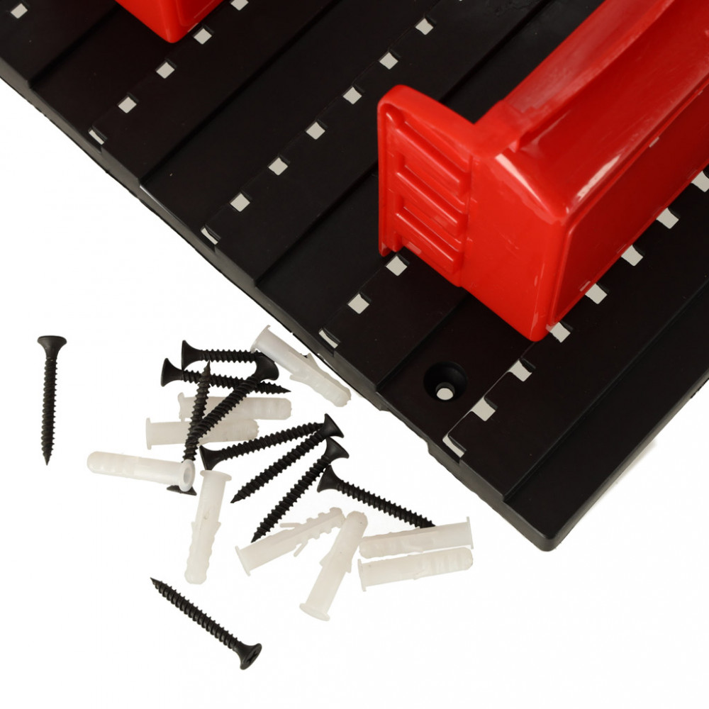 A fali szervező nem foglal helyet a munkafelületen vagy a műhely padlóján. Kényelmesen felakaszthatja a falra, ami hozzájárul ahhoz, hogy több hely legyen a műhelyében.