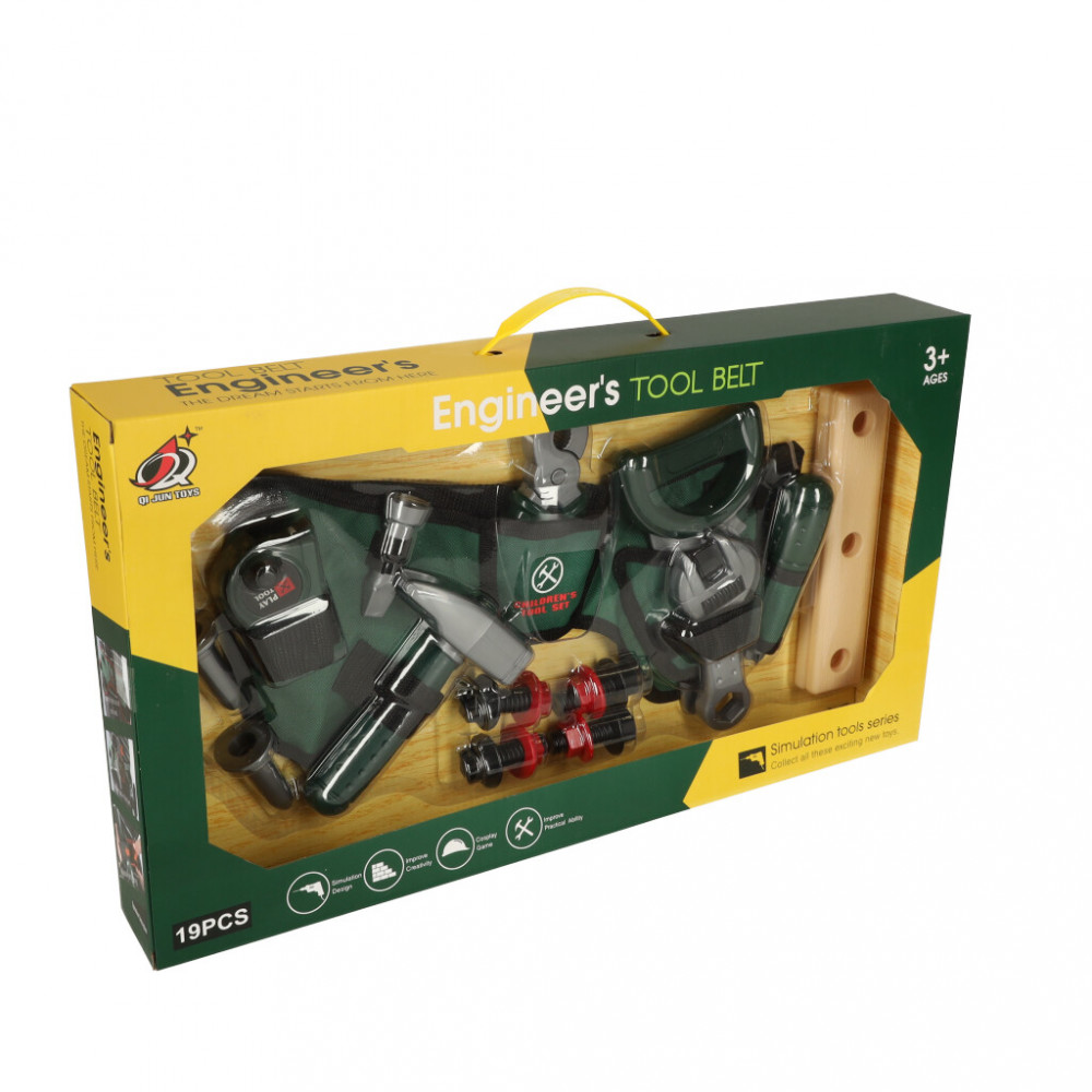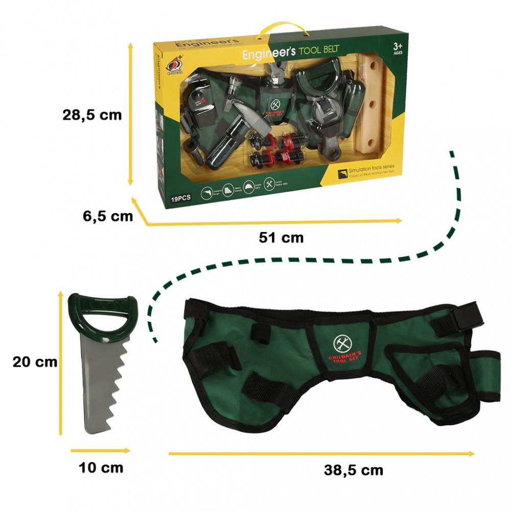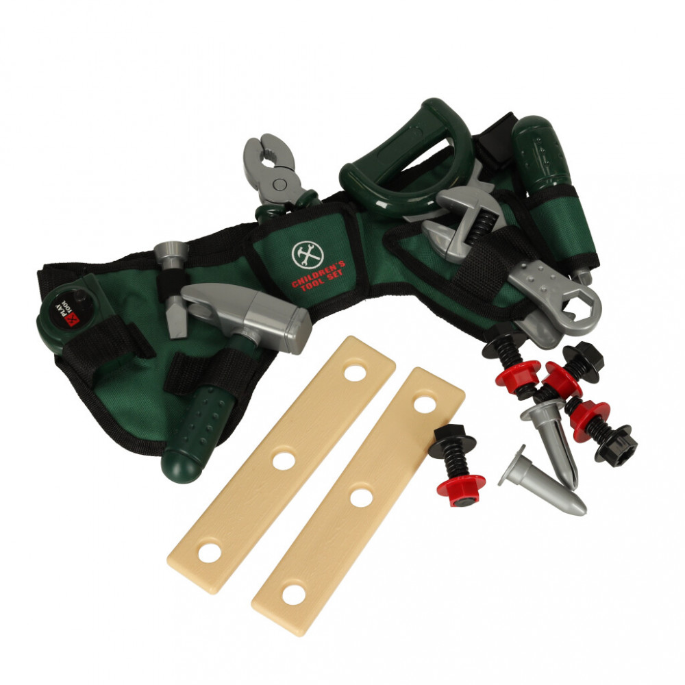 Gyermekszerszámkészlet a fiatal barkácsolás szerelmeseinek. A vele való játék tökéletesen serkenti a képzeletet és fejleszti a kézügyességet. Ezenkívül a készlethez tartozik egy praktikus öv, amelyre a szerszámokat fel lehet akasztani. Anyaga: műanyag. A kalapács méretei: Méretek: 15x9x3,5 cm.