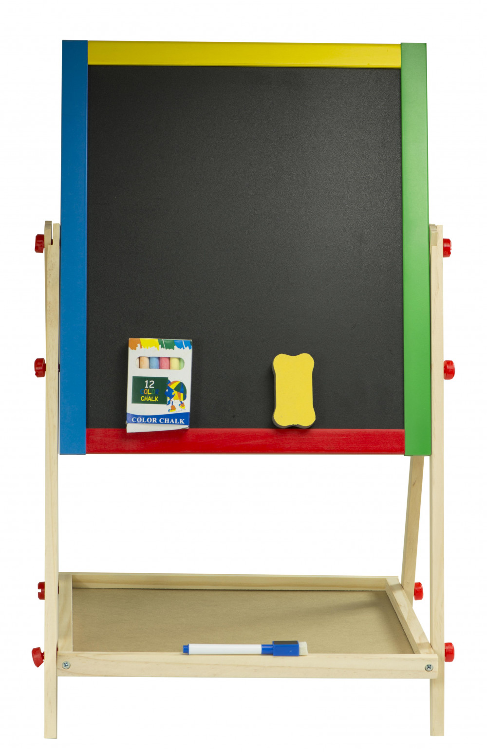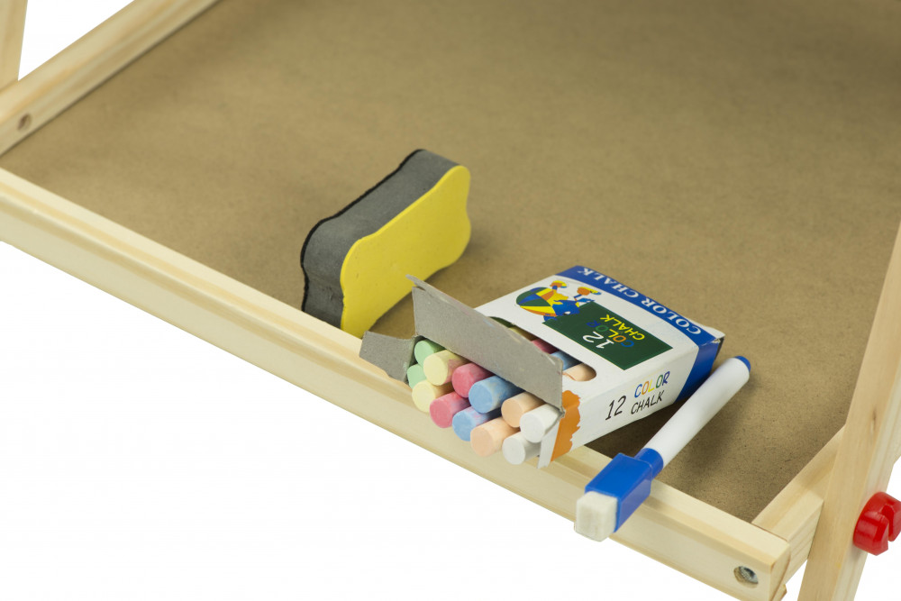 Fehér tábla színes fakeretben, polccal. Az egyik oldalon fekete, a másikon fehér. Tartalmaz krétát, szivacsot és szárazfilctollat. Rajzfelület: 35x40cm.