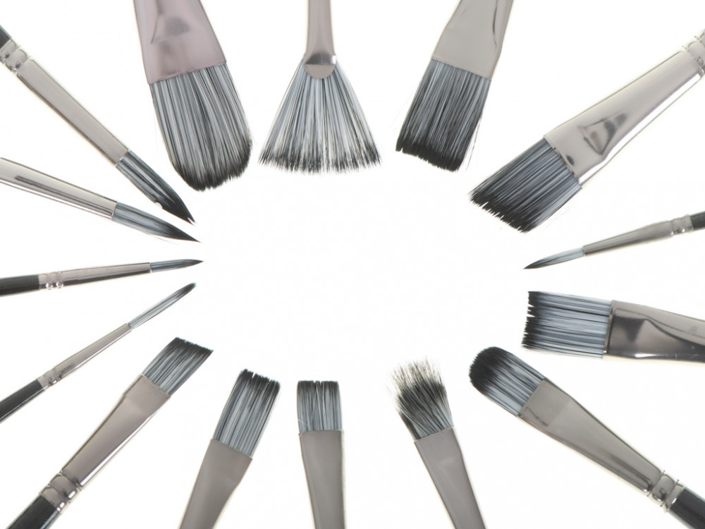 Művész ecsetek és kiegészítők nagy készlete különböző festéktípusokhoz.