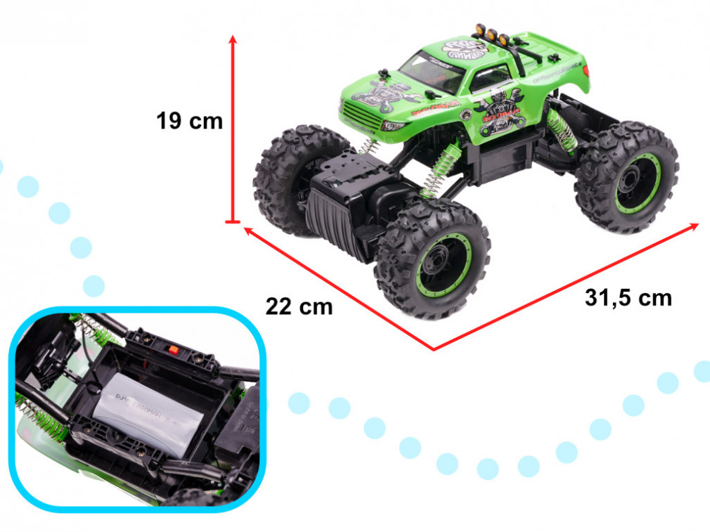 AKADÁLYOKAT MÁSZIK MEG. Márkás NQD Crawler King távirányítású autó - terepjáró 4x4. Gyorsan és hatékonyan mozog 4 irányban. Hatótávolság: akár 60 m. Átlagos vezetési idő: ~10 perc. Tápegység: Li-Po akkumulátor és 9V-os elem. Méretek: 32x17,5x21 cm.