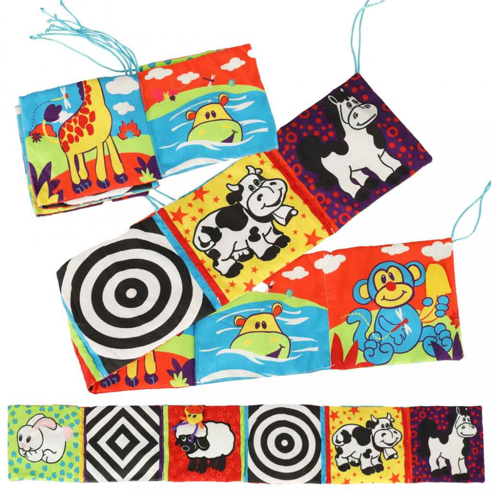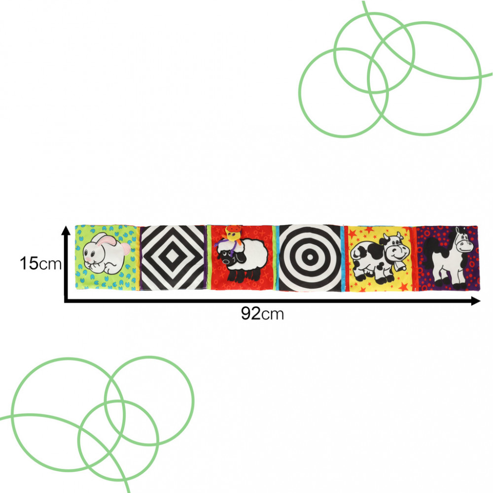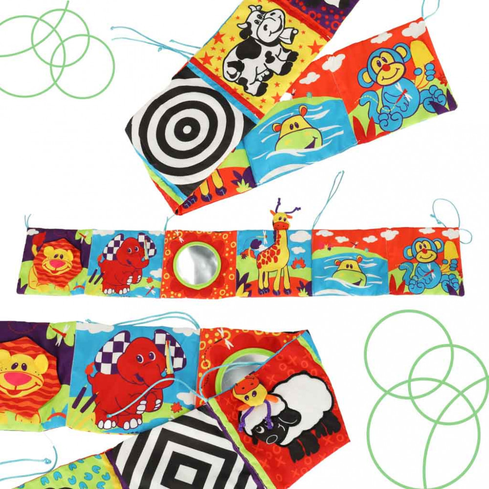 Babaszőnyeg a kiságy védelmére. Hat színes képből készült, tükörrel, zörgő anyaggal és nyikorgóval felszerelve. Oktatási és kognitív funkciójuk van. Tökéletes az élet első napjaitól kezdve. Méretek: 92*15cm.