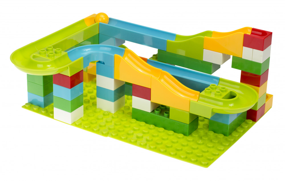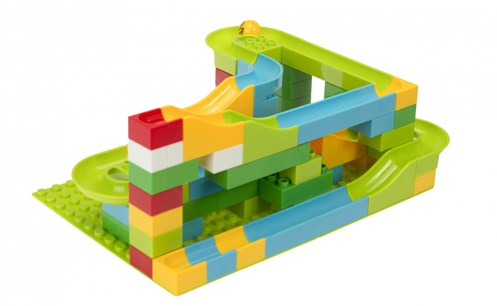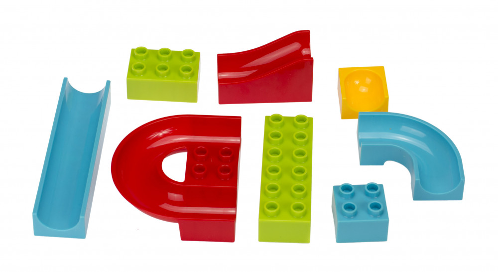 Több darabból álló, színes blokkokból álló készlet bármilyen golyós versenypálya kialakításához. Nagyszerű szórakozás az egész család számára. Serkenti a kreativitást és a logikus gondolkodást. A halmaz 73 elemből áll. Anyaga: műanyag.