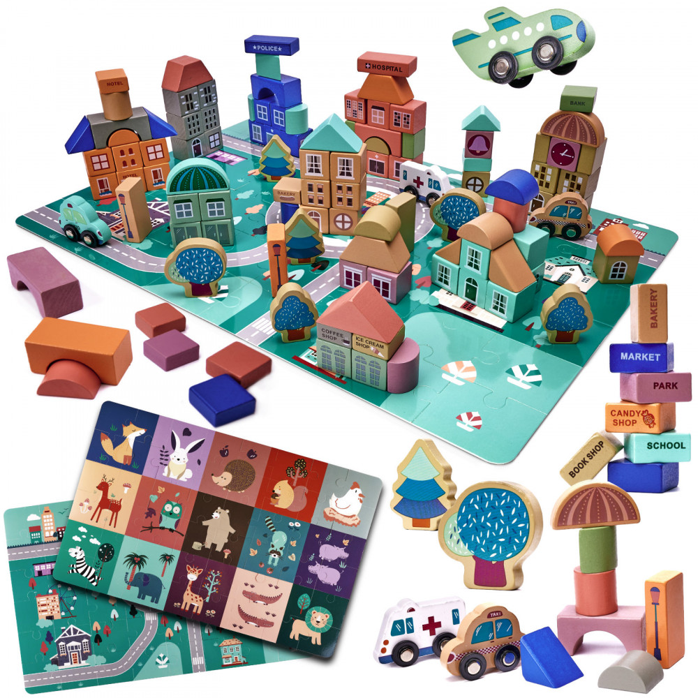 Egy készlet fából készült 133elem blokk. Hasznosnak bizonyulnak a számolás tanításához és a színnevek elsajátításához. Lehetővé teszik a gyermek számára, hogy egy igazi építész szerepét érezze. A téglák között: épületek, járművek, betűk és számok. A szőnyeg méretei: 48x38cm. A blokk méretei: kb. 3x3x3cm.