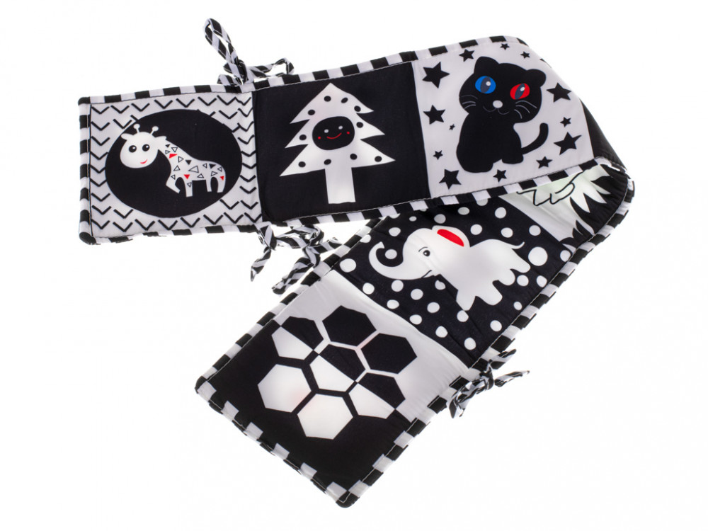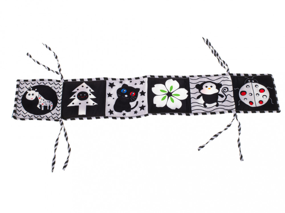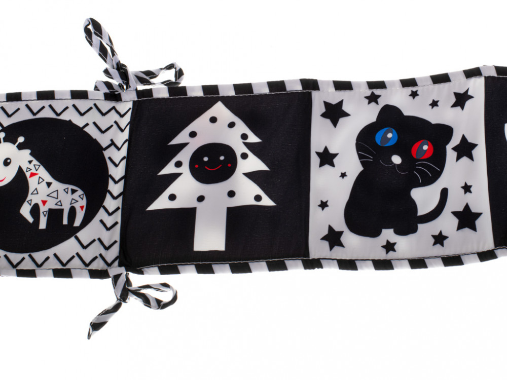 Kétoldalas, összecsukható, hat képből álló kiságyi lökhárító. A kontrasztos színek és a zizegő oldalak érdekelni fogják a babát, és serkentik a látását és a tapintását. Anyaga: poliészter. Design: katicabogár. Méretek kibontva: 82x15.5cm.