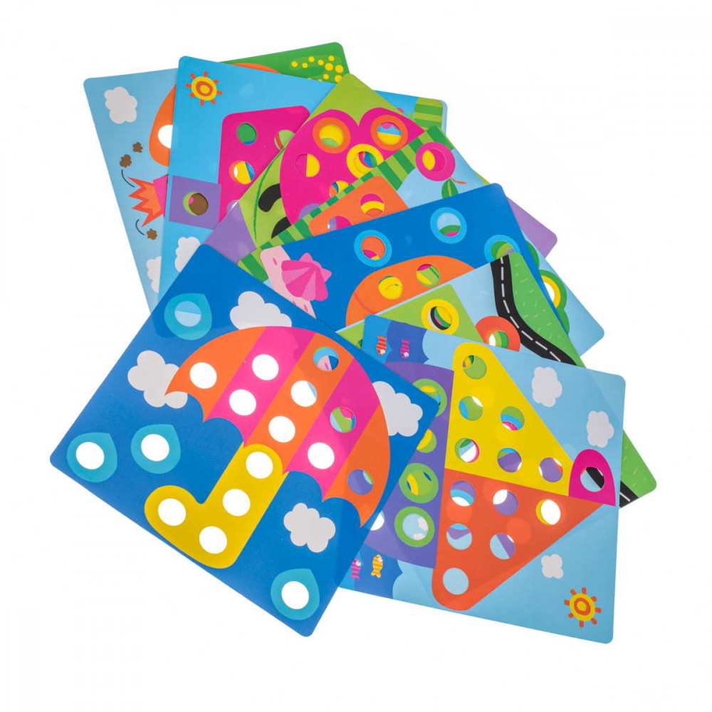 A Button Mosaic egy fantasztikus oktatási kirakós játék, amely támogatja például a színek tanulását, a számolást. A színes készlet 45 gombot, 10 táblát és egy tárolóedényt tartalmaz. A tábla méretei: 24x24cm, gomb mérete 3.5x2.5cm, tartály:25.5x25.5x4cm.