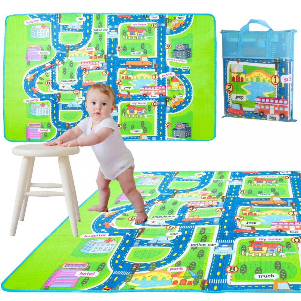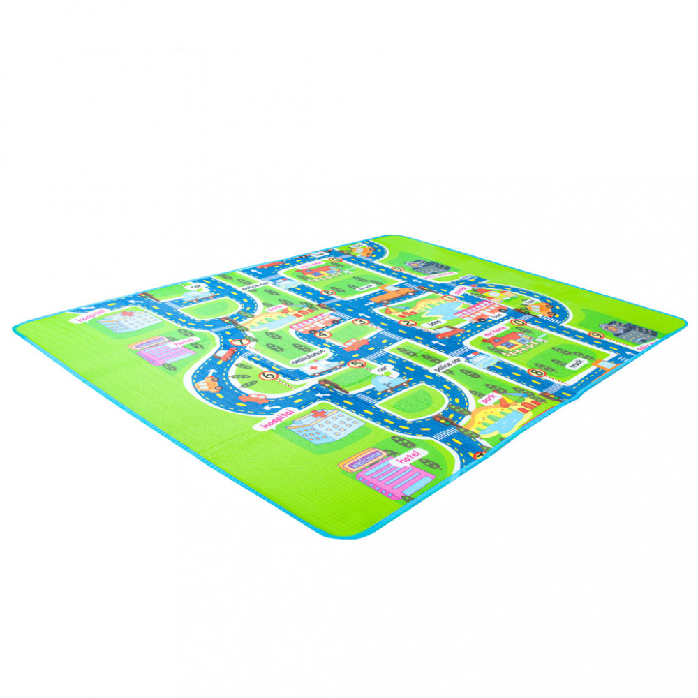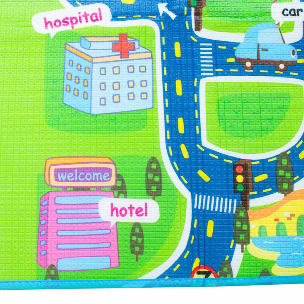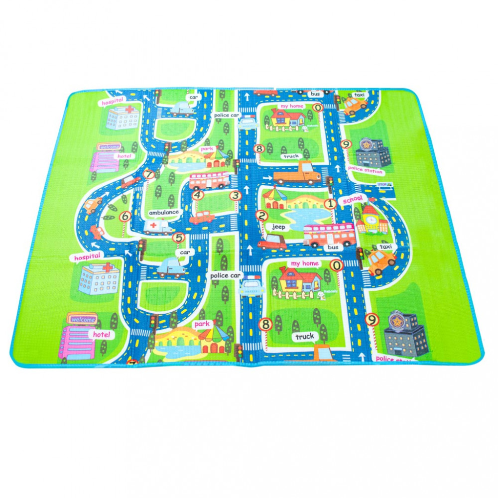 A szőnyeg puha és izalizációs réteggel rendelkezik, amely javítja a gyermek padlójátékának kényelmét. A szőnyeg mintája egy városi utat ábrázol, autókkal és épületekkel. Könnyen tisztítható. Méretek: 1.6m x 1.3m