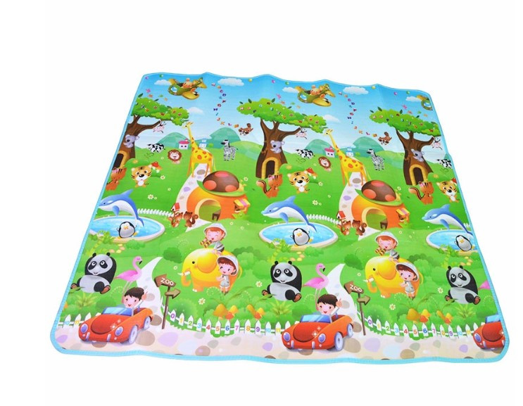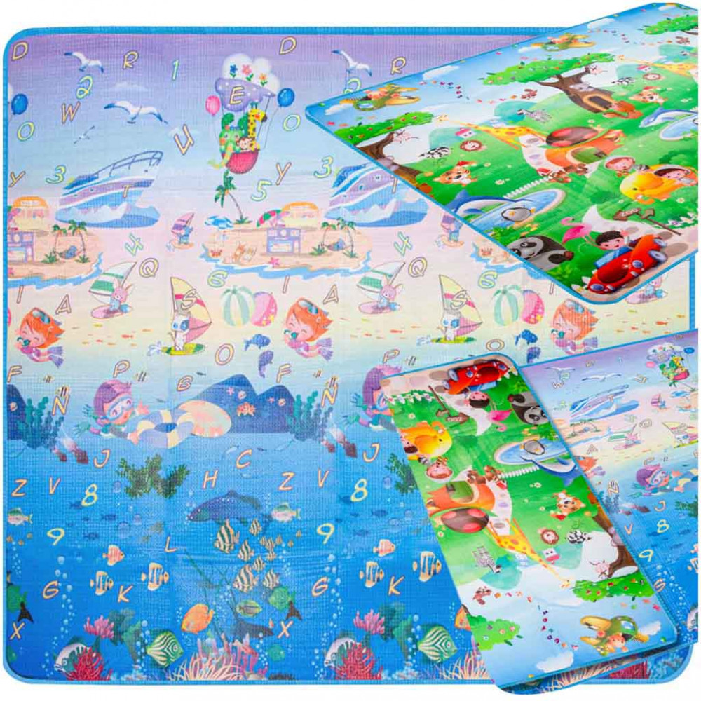 Könnyen tisztítható habszivacs játszószőnyeg gyerekeknek. A szőnyeg mindkét oldala más-más színű mintával van nyomtatva. A szőnyeg egy cipzáras hálós táskába van csomagolva.
