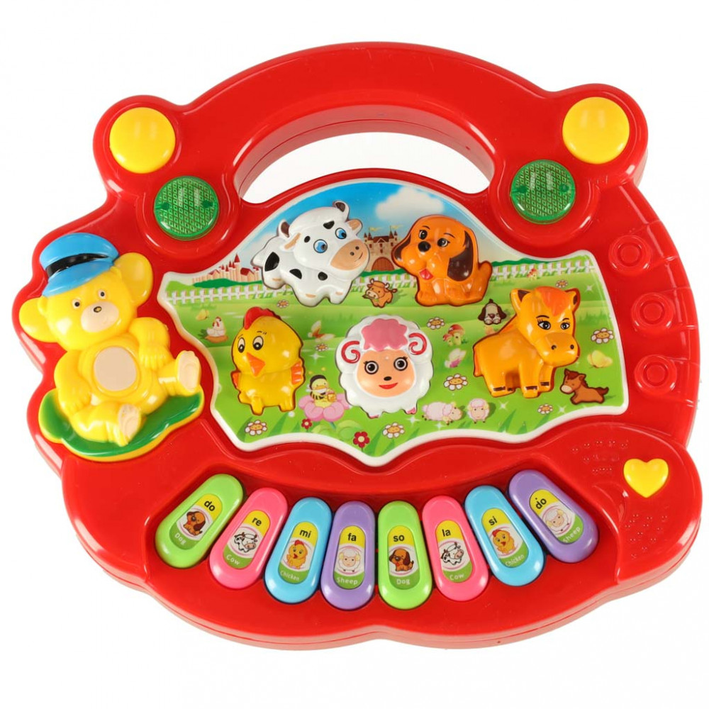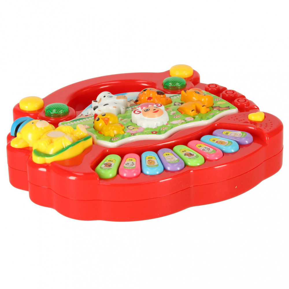 Oktató zongora tanyasi állathangokkal.Műanyagból készült zongora. Az élénk színek, a fény- és hanghatások felkeltik a kisgyermek figyelmét. Két színben kapható (sárga és piros), 3 db AA1,5V-os elemmel működik (nem tartozék). Méretek: 18x16x35cm.