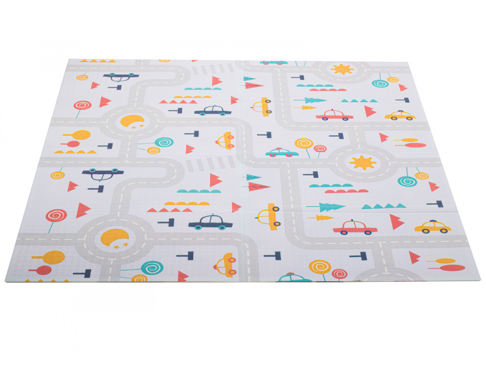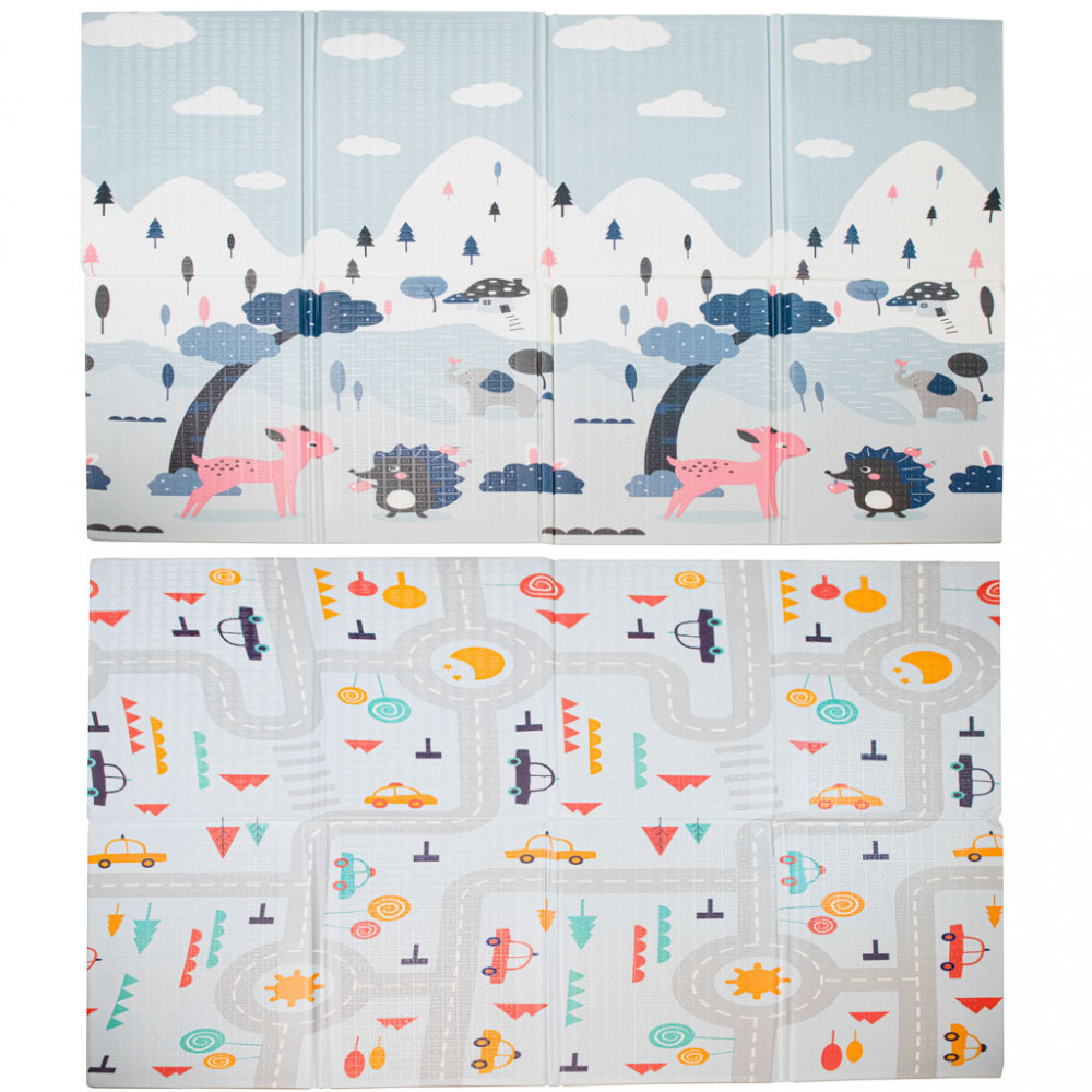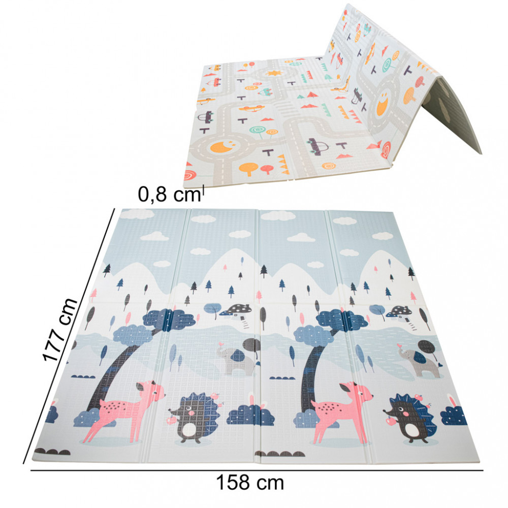 Kétoldalas és összecsukható habszivacs szőnyeg. Az egyik oldalon egy erdő és állatok, a másikon egy utca autókkal. Ideális játékhoz vagy kúszni tanuláshoz. Megvédi gyermekét az eséstől és a hideg padlótól. Méretek: 158x177. Vastagság: 8 mm.