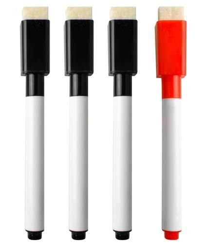 4 FILCTOLL RADÍRRAL ÉS MÁGNESSEL- A készlet 4 filctollat tartalmaz (3 fekete, 1 piros), mindegyik radírral és mágnessel végződik. A radír lehetővé teszi a könnyű és gyors radírozást. Nem kell hozzá nagy szivacsot használnunk. A mágnes lehetővé teszi, hogy a filctollat bármilyen fémtárgyhoz rögzítsük.
