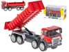 Piros fém billenőplatós teherautó modell, fehér mintával az oldalán.