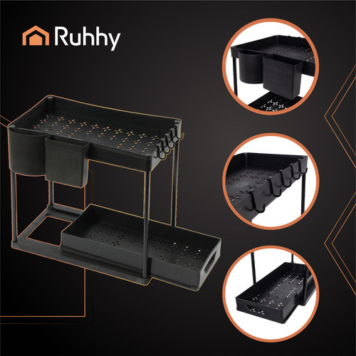 Ruhhy 2-szintes, fekete vasvázú, csúszó polcos konyhai organizer – Praktikus, elegáns tárolási megoldás