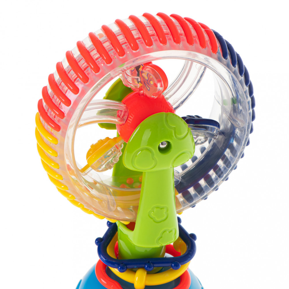 A benne forgó színes golyók csörgőként működnek.