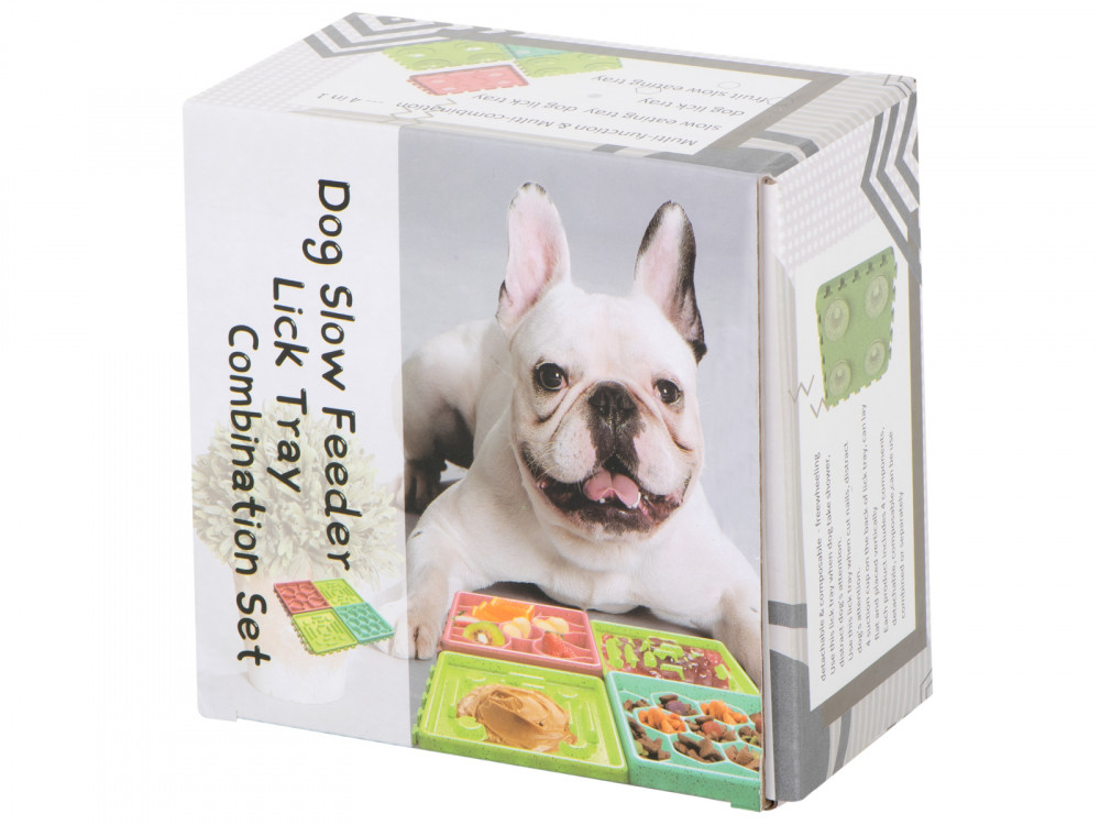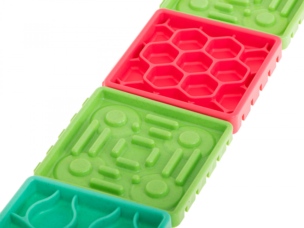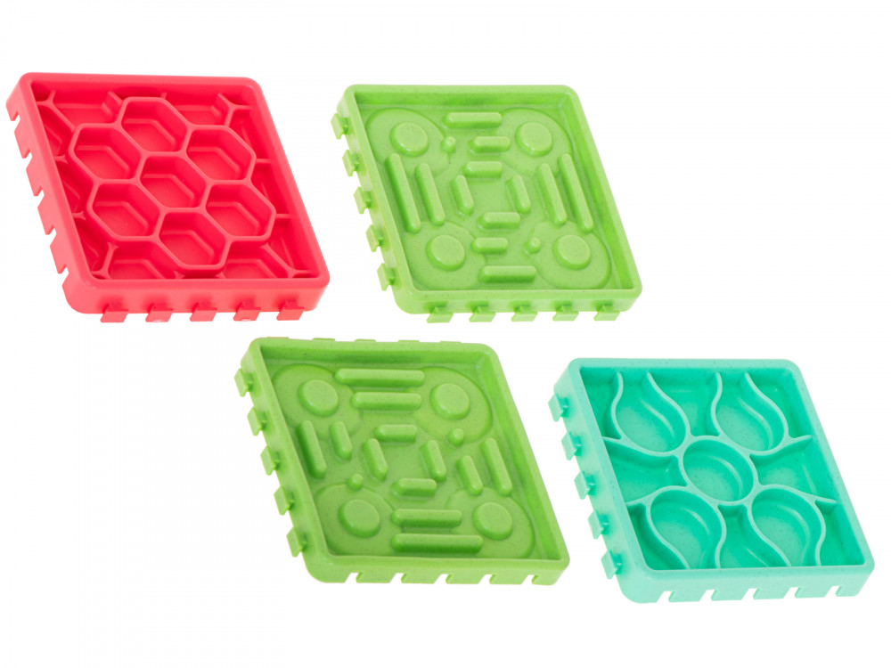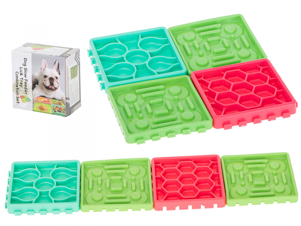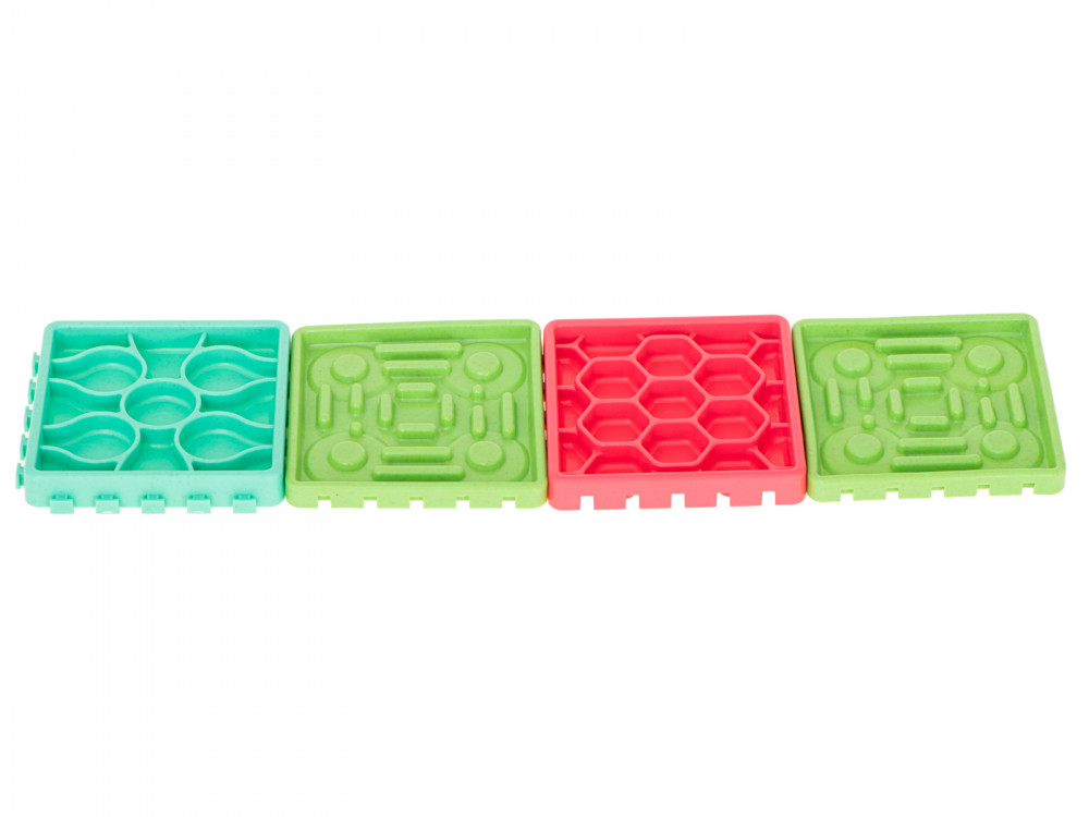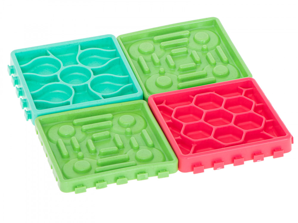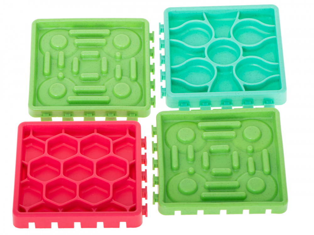 Élelmiszer lassító tál háziállatoknak. Ideális a szőrös háziállatok tulajdonosai számára. Étkezés közben szórakoztató és intellektuális mozgást biztosít kedvencének. 4 különböző tányérból áll, különböző ételekhez tervezve.Matrac méretei: 27.5x27.5x1.5cm.