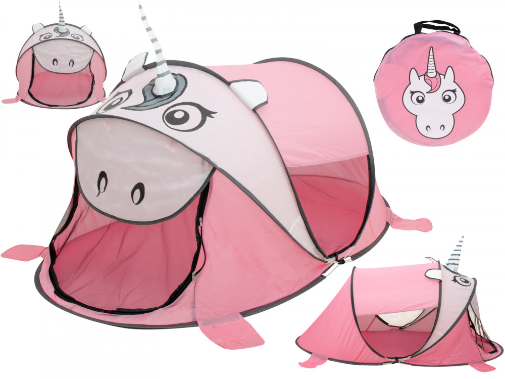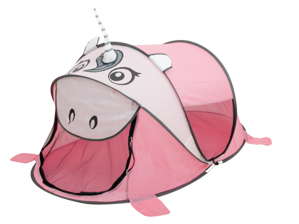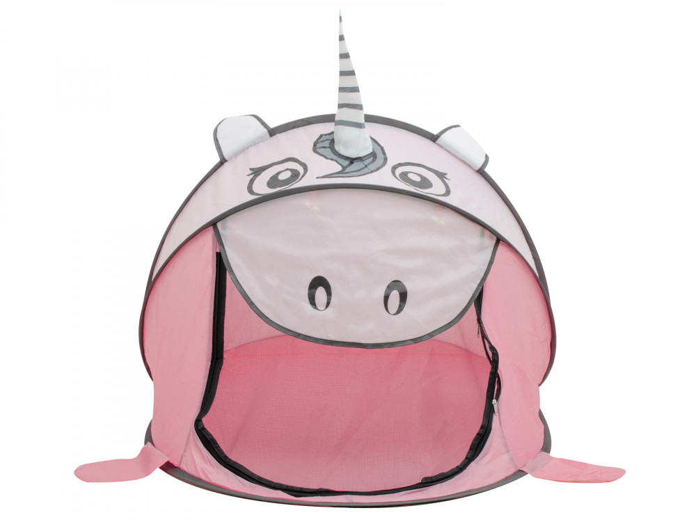 Szenzációs, egyszarvú alakú, összecsukható sátor. Minden kisgyermeknek tetszeni fog. A sátornak van egy bejárata és egy háló az oldalán a jó szellőzés és a szülők számára látható háló. Anyaga: poliészter. Sátor méretei: 180x95x70cm.