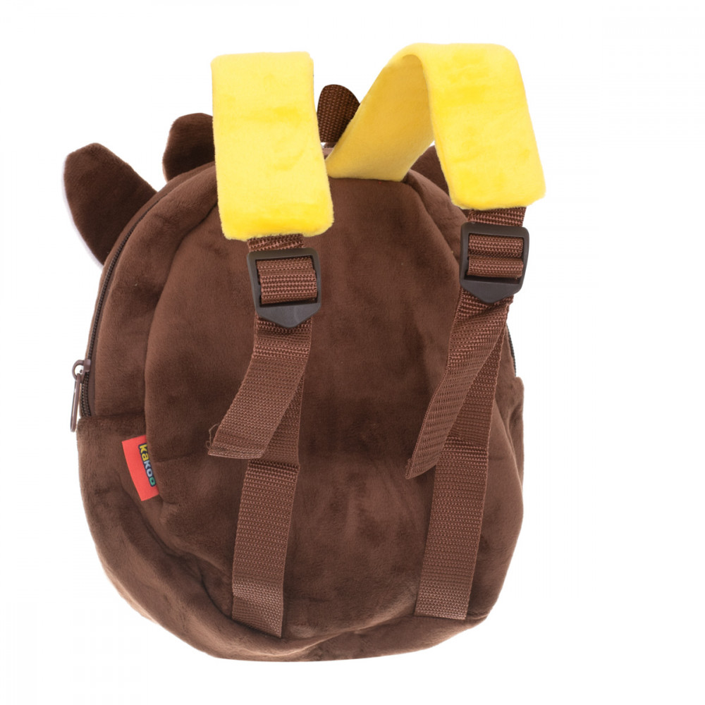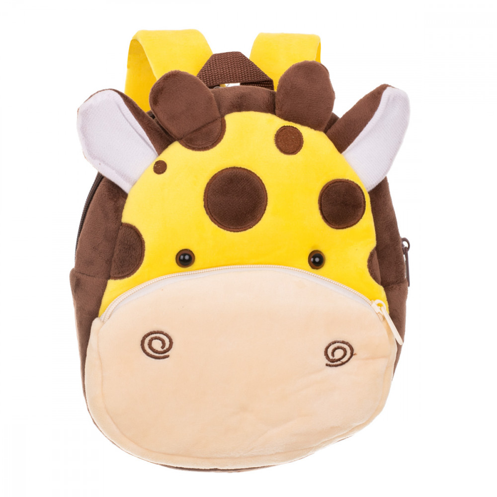 Gyermek hátizsák zsiráf dizájnnal, puha és kellemes anyagból. Két zsebbel (egy nagy és egy kisebb), cipzárral, állítható pántokkal és fogantyúval rendelkezik. Barna és sárga színben kapható. Méretek: 24x7.5x18.5cm.