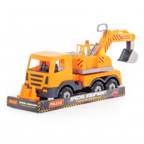 Egy nagy teherautó két utas számára kialakított kabinnal, amelyben könnyedén elférnek kedvenc figurái. Hátul egy vezetőfülke és egy nagyméretű kotrógépváz.