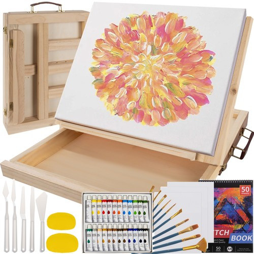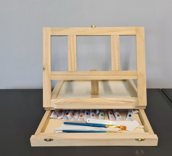 43 darabos festékkészletünk a következőket tartalmazza: különböző színű akrilfestékek, ecsetek és egy fabőröndbe kompaktan elrejtett festőpaletta, amely kinyitva kényelmes festőállvává válik. Helyezzen egy vázlatfüzetet a festőállványra, és engedje szabadjára fantáziáját! Először szeretne vázlatot készíteni, hogy pontosan, lépésről lépésre elkészíthesse munkáját? Ez a készlet tartalmazza az összes festési kelléket, amelyre művészi munkája során szüksége lesz.