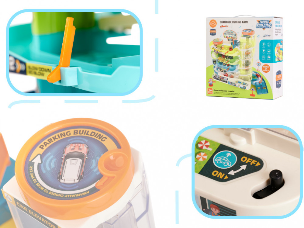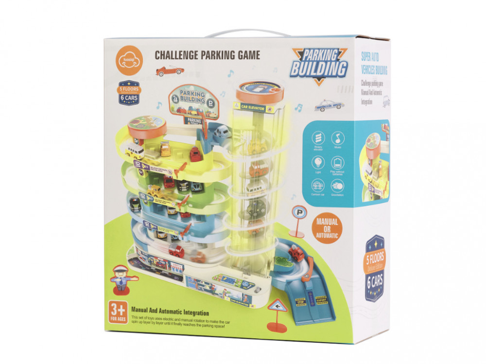 Szenzációs elektromos parkoló lifttel. 4 szinttel és automata lifttel felszerelt. A játék támogatja a kisgyermek megfelelő fejlődését és fejleszti a kézügyességet. Anyag: műanyag. Tápegység: 3 x AA (nem tartozék). A termék méretei: 33x13.5x30.5cm.
